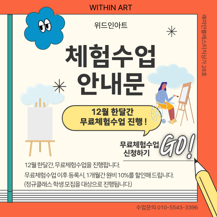 안녕하세요, 위드인아트입니다 12월 겨울방학을 앞두고, 미술을 처음 배우는 친구들도 즐겁게 참여할 수 있도록 체험 수업 이벤트를 진행합니다. 12월 한달동안만 정규클래스를 수강하고자 하는 학생들에 한하여 무료체험수업을 진행하오니 겨울방학동안 미술의 기초부터 차근차근 배우고 싶은 학생들, 창의력과 표현력을 키우고자 하는 학생들, 몰입을통한 자아의 재발견을 경험하고자하는 학생들은 아래의 번호로 문의 주시면 시간 조율 후 예약 및 상담을 도와드립니다. (체험수업은 정규클래스 시간 이외의 시간에 진행되며 정규커리큘럼과 동일하게 진행됩니다.) 위드인아트 인스타그램 https://www.instagram.com/within....... <img src="https://blogthumb.pstatic.net/MjAyNTExMzBfMTUx/MDAxNzY0NTA5NjE3NDA0.wOa3DlgVptaIDK3gL9EsFqgj58Ox3rj0huEiEIDPgYMg.QrrhA1hw3XjsYlGz40WUAXWzHdPtZEKv-BBMn0--_XMg.PNG/%C3%BC%C7%E8%BC%F6%BE%F7%BE%C8%B3%BB%B9%AE2025.12..png?type=s3" />