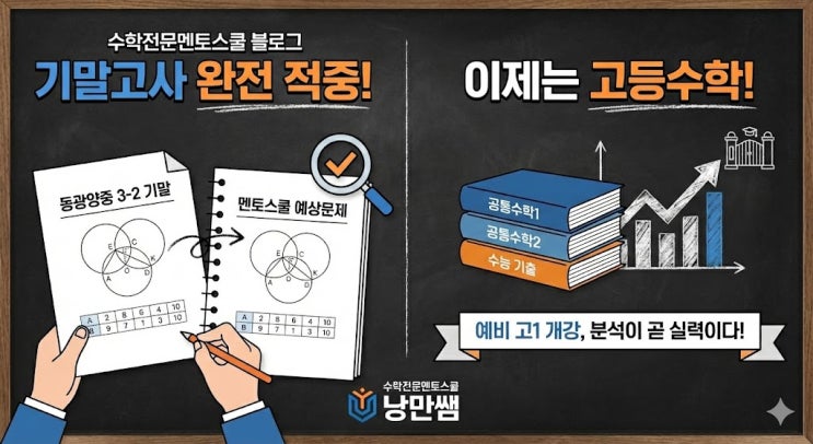 안녕하세요. 수학전문멘토스쿨학원 원장, 낭만쌤입니다. 치열했던 2학기 기말고사가 모두 마무리되었습니다. 시험을 준비하느라 밤낮으로 고생한 우리 동광양중학교 3학년 학생들에게 뜨거운 박수를 보냅니다. 이번 시험은 중학교 과정을 마무리하는 마지막 시험이자, 고등 수학으로 넘어가는 징검다리 역할을 하는 중요한 시험이었습니다. 오늘 포스팅에서는 동광양중학교 3학년 2학기 기말고사 문항 분석과 함께, 시험 전날 아이들에게 **"이건 무조건 나온다"**고 강조했던 멘토스쿨의 예상문제가 실제 시험에서 어떻게 적중했는지 그 놀라운 결과를 공개합니다. 1. 동광양중 3-2 기말고사 총평 난이도: 중상 출제 경향: 기하(원): ....... <img src="https://blogthumb.pstatic.net/MjAyNTEyMDZfMTQ3/MDAxNzY1MDA2MzE2NDYz.qLqu9tXsft2fm2Ge-BRzF19Wg4Af5f1wCKHJvst5su8g.zImxEBBEHOiHY3ZixtS-vP4HNo0qfoFOf1Zi5OiPs2sg.JPEG/unnamed.jpg?type=s3" />