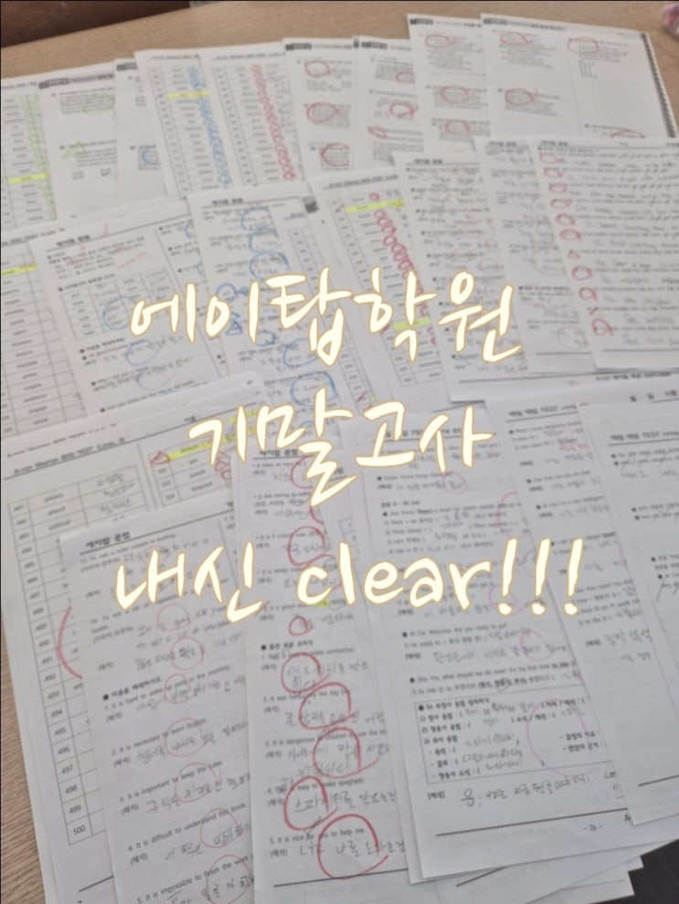 안녕하세요. 에이탑 학원 수진쌤입니다. 지금은 2학기 기말 고사 대비기간이고 우리 학생들 올해의 마지막 시험을 위해서 열심히 공부를 하고 있습니다. 우리 에이탑 학원의 중등부들이 얼마나 열심히 공부를 하는지 보여 드릴께요. 제가 항상 손으로 공부를 하는 것을 강조하다보니 아이들이 열심히 공부한 흔적들이 늘 남아 있습니다. 정말 버리기에는 너무 아까운 학생들을 공부 흔적과 우리 학원 학생들이 공부하는 모습들을 기록해 볼까 합니다. 우리 에이탑 학원에서는 내신 대비 기간 동안에 중등부의 경우 문법을 철저하게 훈련을 시킵니다. 최근에 서술형 문제의 난이도가 상승하고 영작을 하는 유형이 많아지면서 관련 문법을 적용해서....... <img src="https://blogthumb.pstatic.net/MjAyNTEyMDZfOTYg/MDAxNzY1MDE0NDYxOTEz.AQL66_luD7u3AnoZTLYRXYAk0saTfPhnbY2Nysr5DrAg.Us5lmMbur_O7-iqkwaLiIMBpNCJndMKdN6MKWhGM0aAg.JPEG/900%A3%DFScreenshot%A3%DF20251205%A3%DF135436%A3%DFVLLO.jpg?type=s3" />
