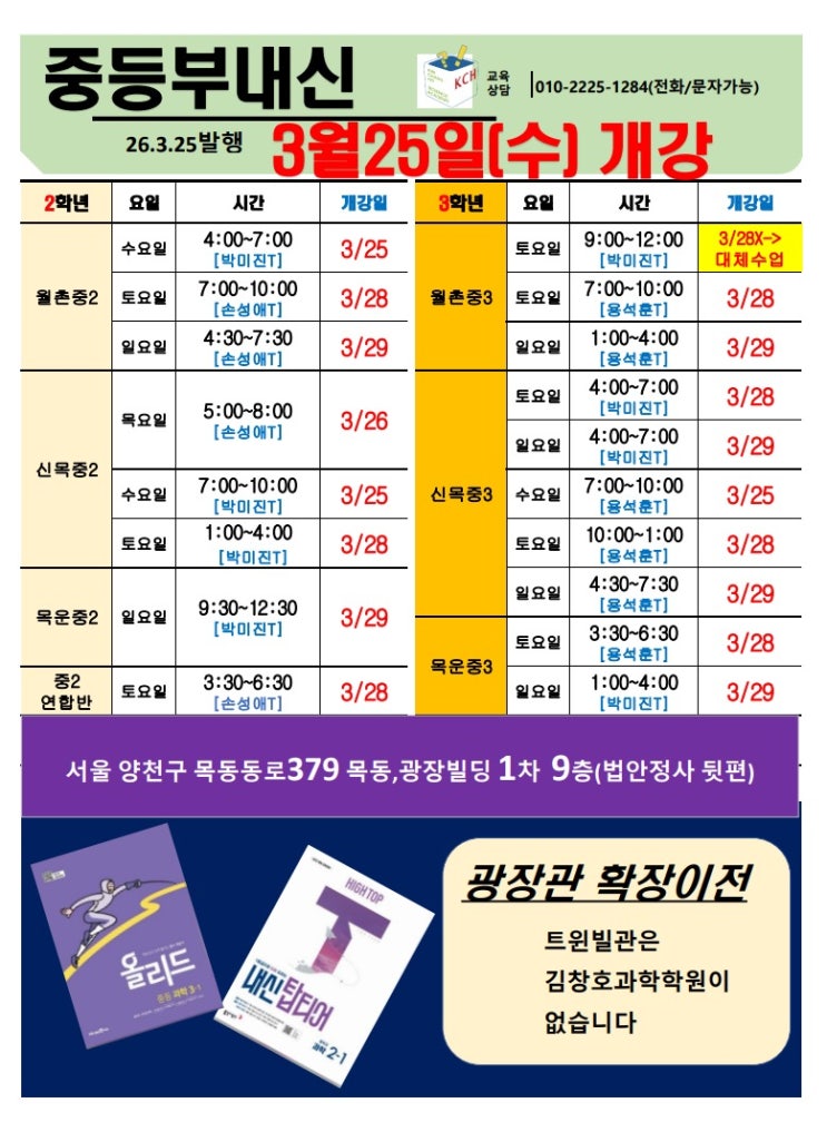★3/2(월)부터 광장관 확장 이전★ 트윈빌관에서 분위기가 확 바뀌어진 김창호과학학원(고등관.본관) 광장빌딩 1차 10층(법안정사 뒷편)으로 이전했습니다. 주소:양천구 목동 동로379. 광장빌딩1차 9층(중.고등부).10층(고등부) ★ 과탐 중간고사 대비 프로그램 시간표 입니다. 자세한 상담은 문자로 남겨주시면 순차적으로 연락드리겠습니다. H.P 010-2225-1284 *일부 시간표는 변경될 수 있습니다. *매 주 테스트 진행 후 레벨이 맞지 않는 경우에는 반 이동이 가능합니다 청운재 꿈을 이루는 공간(인재를 기르는 공간) 고2.물리.화학 수강 희망 학생은 입학테스트를 진행하며 결과에 따라 반이 배정됩니다 ★고2 물리 수.4:40~7:20 마감!!! ★....... <img src="https://blogthumb.pstatic.net/MjAyNjAzMjVfNDkg/MDAxNzc0NDIxNDEwMzY4._Tt_dzanlIXXdOMIq-3doxb8_0PMXNRZQVzHm8ElUhsg.D190O5B_SojWlEoGdFfbA6Kunk5ibBs6UYPQ8NEET64g.JPEG/%C1%DF%B5%EE%B3%BB%BD%C5.jpeg?type=s3" />