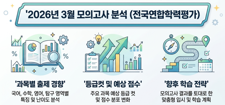 2026년 3월 모의고사 분석 [고1] 3월 고1 모의고사는 고등학교 입학 후 처음 치르는 시험으로, [고등 학습 적응도]를 확인하는 성격이 강합니다. 전반적으로 중학교 과정과 연결된 개념들이 출제되었지만, 일부 과목에서는 고등학교 방식의 문제 풀이를 요구하는 문항도 포함되어 체감 난이도는 다소 높게 느껴졌을 수 있습니다. 특히 국어 영역은 지문 길이가 길어지고 정보량이 많아지면서 시간 관리의 중요성이 크게 드러났습니다. 수학은 개념 자체는 어렵지 않았지만, 문제를 해석하고 적용하는 과정에서 실수를 유도하는 문항들이 눈에 띄었습니다. 영어는 기본 어휘와 문장 구조 이해가 중요하게 작용했으며, 독해 속도에 따라 점수 차이....... <img src="https://blogthumb.pstatic.net/MjAyNjAzMjdfMzAg/MDAxNzc0NjAxNzgxOTM5.D0hoUKcbaNzHf0lwWaWYxrkqZASbQkScP-RZ_sn5Kpog.wJZMdA00zNsu9AAuxoTVkugN807yoLM_jw_MUdhw-q0g.PNG/Gemini_Generated_Image_u06lfhu06lfhu06l.png?type=s3" />