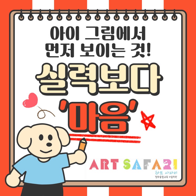 안녕하세요, 아트사파리 미술학원입니다 요즘 부쩍 추워진 날씨 속에서도 아이들의 웃음소리는 유난히 더 밝게 느껴지는 하루하루입니다. 도화지 앞에 앉아 연필을 쥐고 집중하는 아이들의 모습을 보고 있으면, 그 작은 손끝에서 어떤 마음과 생각이 펼쳐질지 늘 설레는 마음이 들어요. 아트사파리의 미술 수업은 ‘얼마나 잘 그렸는지’보다 아이 스스로 어떤 마음으로 표현했는지를 더 중요하게 생각합니다. 그래서 이번 수업은 아이의 정서와 자존감, 그리고 자기 마음을 믿고 표현하는 힘에 조금 더 집중해보는 시간이었어요. 수업을 하다 보면 “이렇게 해도 돼요?” “틀린 거 아니에요?” 라고 묻는 아이들을 자주 만나게 됩니다. 그....... <img src="https://blogthumb.pstatic.net/MjAyNjAyMTBfODIg/MDAxNzcwNzMyMTQwNjYx.gDQJwArQgNyg62g_YLdFDe3O1rQovQ0_oMIlh4G6BjAg.7S57ziWtRCUYoKnFNRqAMxoDIEJs7V6UwLi-zPD2CD8g.JPEG/%C1%A6%B8%F1%C0%BB-%C0%D4%B7%C2%C7%D8%C1%D6%BC%BC%BF%E4_-001.jpg?type=s3" />