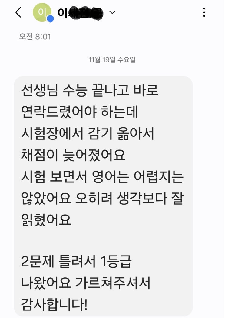 전북에서 입증된 수능영어1등급완성 2026학년도 수능영어 결과치 수능영어파이널 4개월의 여정 지방에서의 수시중심의 학습 특성상 수능영어를 본격적으로 진행할 수 있는 시간은 결국 1학기 내신 끝내고 많아야 4개월 그 시간동안 실력이 어떠하든, 무조건 점수를 최소 2등급을 만들어야 하는 여정입니다. 올해 처음으로 전북에서 수능영어수업을 진행했으며, 문자로 연락을 준 수강생의 결과치는 다음과 같습니다. 수능영어와 고등내신 결과치 전주 중화산동에서 수업진행 수 많은 결과치로 구성된 강철영어, 전주혁신에 이어 중화산동에서도 진행하게 됩니다. 고3과 재수생을 중심으로 하는 수능영어를 집중으로 하고, 고등내신영어를 진행할....... <img src="https://blogthumb.pstatic.net/MjAyNTExMzBfNDQg/MDAxNzY0NDcxMzU2NTQ0.R9DOaviWShIHN_tnhLPammocOCB76A0GDORhP2t8Y-cg.tX2VZPW17iYNvmTOADczbMBwVwje0XOhqwUI9wYqhWIg.JPEG/%BC%F6%B4%C91%B5%EE%B1%DE_%BC%BC%C1%F8.jpg?type=s3" />