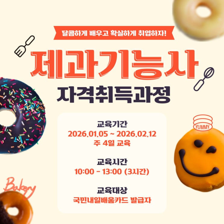 안녕하세요. 대성직업전문학교입니다! 여러분! 내일 영하로 떨어진대요... 옷 따숩게 입으시고 외부활동 하시길 바랍니다 근데 약간의 첫눈 기대감도 안고 출근하셔도 좋을 것 같습니다 ㅎㅎ 본론으로 넘어가서 오늘은 오랜만에 제과기능사 실기과정을 소개해드리려고 합니다! 한번 자세히 알아볼까용? 제과기능사(실기) 자격취득과정 교육기간: 2026.01.05 ~ 2026.02.12 (주 4일 교육) 교육시간: 10:00 - 13:00 (3시간) 교육대상: 국민내일배움카드 발급자 교육혜택: -시험장과 동일한 환경과 장비로 실습교육 (시험전 실습실 사용,보강) -1:1 맞춤형 실습지도 -자격증 취득, 실무마스터 취업 경쟁력 UP! -교내 넓은 주차공간, 구내....... <img src="https://blogthumb.pstatic.net/MjAyNTEyMDJfMzkg/MDAxNzY0NjM3NjA2MzI0.6IvOzbW7dKwwo-nlD0MWUppWSm05rmcTR0EvnP4nY-8g.vqLDIoshn82c_cRmPoP-qNQxGx6zG55yHcIXgKpO-_Qg.JPEG/%C1%A6%B0%FA.jpg?type=s3" />