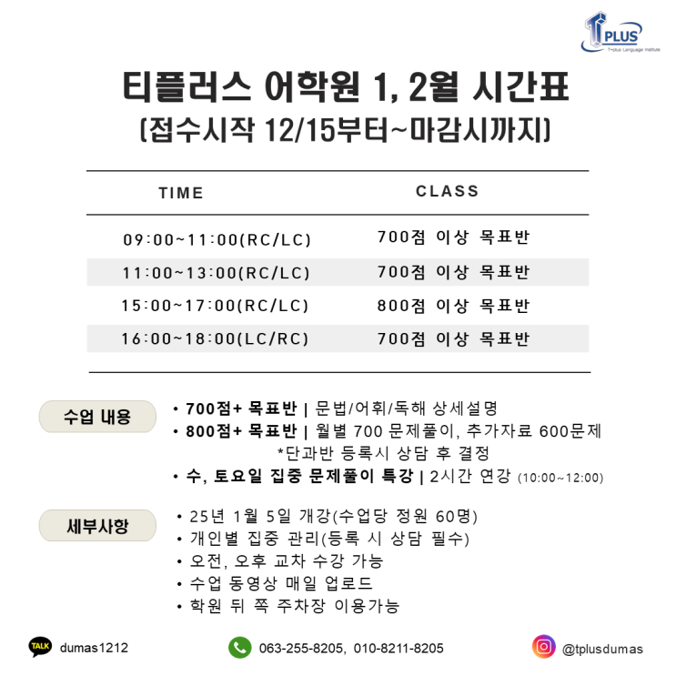 안녕하세요. 티플러스 어학원입니다. 26년도 1,2월 시간표를 공지드립니다 :) 접수는 12/15부터 상시 받고 있으며, 1월 5일 개강합니다. 1, 2월 시간표 (12/15일 부터 ~ 마감시까지 접수, 1/5 개강) 티플러스 어학원은 토익 단기 졸업을 위한 가장 빠른 길을 안내해드립니다. 시간 및 등록반에 대한 전화 혹은 방문상담 가능하오니, 아래 문의처로 연락 부탁드리겠습니다 :) 감사합니다! 전화 문의 | 063-255-8205, 010-8211-8205 카카오톡 문의 | dumas1212 친구 추가 <img src="https://blogthumb.pstatic.net/MjAyNTEyMDRfMjEg/MDAxNzY0ODE2MDIwMzIw.jxHYg2fO705yzRGBEFOt0W-EkTnsqRHGSEnZqBifD_cg.SiJ9o7_sdno9IoMD-CcMlS2p_VuCiEM9j0E8r8Z3jagg.PNG/%28%BE%E7%BD%C4%29_1.2%BF%F9_%BD%C3%B0%A3%C7%A53.png?type=s3" />