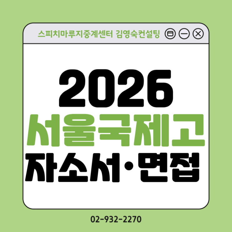 안녕하세요! 스피치마루지 중계센터 김영숙컨설팅입니다 ^^ 다가올 2026 서울국제고 입시를 준비하면서 많은 학생들이 가장 어려워하는 부분은 바로 “자기소개서와 면접을 어떻게 연결해야 할까?” 하는 고민입니다. 서울국제고는 단순히 영어 성적만 좋은 학생을 선발하지 않습니다. 개인의 경험을 명확하게 표현하고, 그 과정을 논리적으로 설명할 수 있는 학생을 선호합니다. 이 차이를 만들어주는 것이 바로 ‘단단한 스토리 한 줄’입니다. 이 글을 끝까지 읽으면 서울국제고 입시 준비 방향이 훨씬 선명해지고, 자소서와 면접 전략도 한층 체계적으로 잡을 수 있을 거예요! [특강신청폼] 서울국제고 일정 인터넷 원서 접수 12/3(수) ....... <img src="https://blogthumb.pstatic.net/MjAyNTEyMDdfOTAg/MDAxNzY1MDY1MTExNjEw.f23d_P0YDcfz_n5JrTWV8hZrm8Ed7ESqAK54JvhIh4gg.tLfEVkg5C8LXb5-q0gOGgoOQXYAlmqzPUG7pQopGjXcg.PNG/1_%BD%E6%B3%D7%C0%CF_%BC%AD%BF%EF%B1%B9%C1%A6%B0%ED.png?type=s3" />