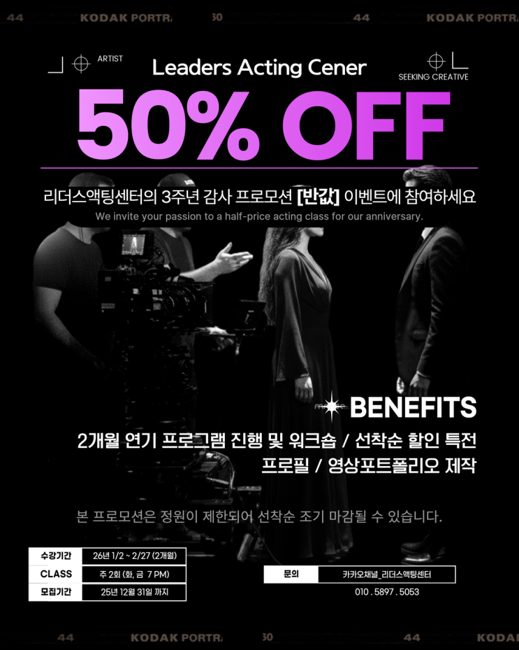 안녕하세요! LAC 리더스액팅센터 입니다. 강남연기학원 리더스액팅센터의 3주년 감사 프로모션 이벤트가 시작되었습니다. 배우를 꿈꾸는 모든 이들에게, 단 한 번뿐인 기회! 함께한 시간 3년, 저희 리더스액팅센터를 믿고 찾아주신 모든 분들께 진심으로 감사드립니다. 그 감사의 마음을 담아, 운영 이래 최초로 50% 특별 할인 이벤트를 진행합니다. 해당 프로모션은 3주년 기념 감사 프로모션으로 반값할인이 적용 됩니다. [단, 이 프로모션은 특별합니다] 이번 감사 프로모션은 연기와 배우, 아티스트로서의 길에 진심인 분들만을 위한 기회입니다. 실력은 부족해도 괜찮지만 열정과 의지가 부족하다면 정중히 사양합니다. 열정과 의지를 가지....... <img src="https://blogthumb.pstatic.net/MjAyNTEyMDVfNjcg/MDAxNzY0OTIzODQ4MTU3.vAiNRiklQnY2jbldb_mCMcrxFnFUeQj9cmwOGTMr_Kkg.B4UOdCIdOEgzJbW0UHlzUyv8cgCRlhj1bmIN6ZqkCjcg.PNG/%B9%DD%B0%AA%C7%D2%A4%A9%C0%CE.png?type=s3" />