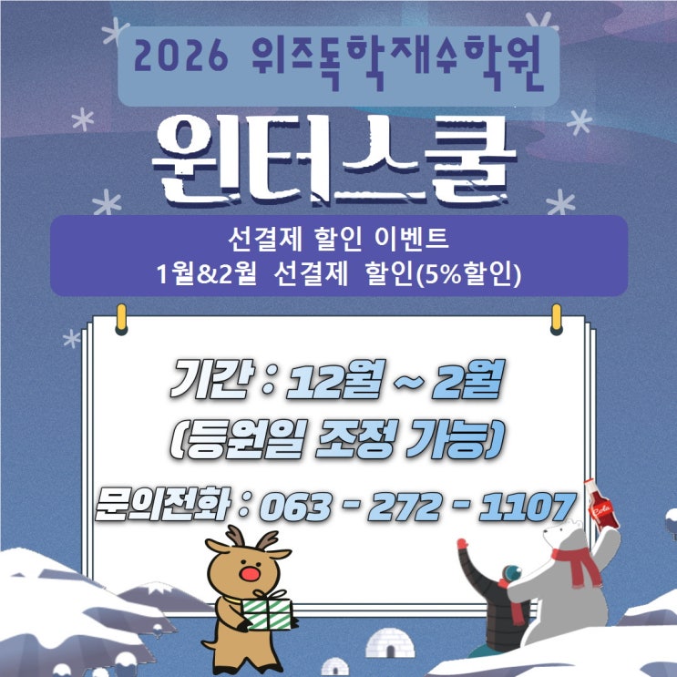 <위즈 윈터스쿨 포스터> <위즈가 제공하는 프로그램 안내> 1. 목표 컨설팅 진행 2. 주간 캘린더 작성 3. 상시 학습 컨설팅 진행 4. 주요과목 1:1 질의응답 진행 5. 일주일 의무학습 67시간 <위즈독학재수학원 재학생 윈터스쿨 예약 안내> 학원전화 : 063-272-1107 문자예약 : 010-7715-6607 궁금한 사항은 학원 전화로 연락주시면 빠르게 안내 도와드릴 수 있습니다. 감사합니다 ^.^ 걸어갈 모든 순간이 위즈와 함께 찬란하게 빛나길 힘겨운 날에 견뎌낸 시간이 언젠가는 밝게 비추길 <img src="https://blogthumb.pstatic.net/MjAyNTExMTdfMTA1/MDAxNzYzMzY1NTcwMTQw.3iqbJcOBeYlQK1SgzF-i6wqYLyMAHMf3C0OnnpGm2zkg.NrlbPVMfkZyKYb2CbdK0WjRLpRTgyPdIXETkHuZ1E-8g.JPEG/%B2%D9%B9%CC%B1%E22%B2%D9%B9%CC%B1%E22026%C0%A9%C5%CD.jpg?type=s3" />