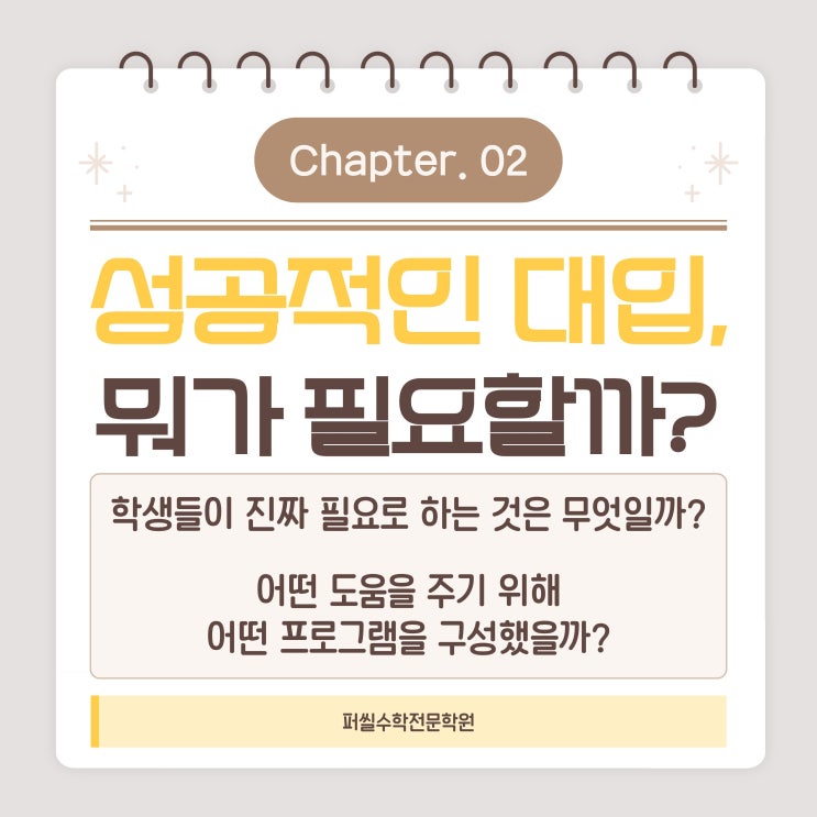 안녕하세요! 퍼씰수학전문학원입니다. 오늘은 저번 포스팅에 이어 성공적인 대입을 위해 어떤 요소들이 필요하고, 또 퍼씰은 어떤 도움을 주고 있는지 함께 알아보려고 하는데요! 학생들은 어떤 도움을 필요로하고, 또 우리는 어떤 도움을 줄 수 있을까? 퍼씰은 학생들의 "진짜 니즈" 를 파악하고, 충족시켜줄 수 있게끔 다양한 프로그램을 구성하고, 운영해왔습니다! 그래서! 오늘은 학생들이 "진짜" 필요로하는 도움을 주기 위해 구성한 프로그램들! 5. 생기부 컨설팅 6. 학생 개별 관리 7. 퍼씰 고민 상담소 이렇게 세 가지를 알아보도록 할텐데요! 그 전에! 이전 시리즈를 읽지 않으셨다면 먼저 읽고 오시는 걸 추천드립....... <img src="https://blogthumb.pstatic.net/MjAyNTEyMDNfMTk2/MDAxNzY0NzQ0NzI0NjAx.OQt2qKr48rmPhu5zNXTX798PHPAnarqAU6OLXwriK6Ag.HTViPQQIBB3V7bBTXEpP5Cie7b8dAGSPjcvNZHc7oMEg.JPEG/9.jpg?type=s3" />