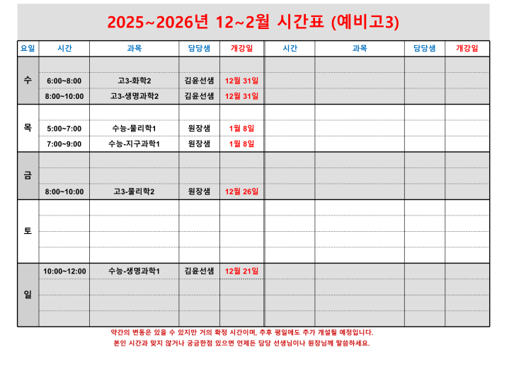 【수능반】 21~27학년도 수능특강, 수능완성 자이스토리, 마더텅 모의고사 【내신반】 물리학2(비상교육의 완자) 화학2, 생명과학2(수능특강) <img src="https://blogthumb.pstatic.net/MjAyNTEyMDVfMTcz/MDAxNzY0OTM3NDY3MDA2.UNJGZLvtdHNBYZN6F-UufVeEANIMna4_Tr13j_hb0-cg.Ap0uGEE4qYZMgzBQAReHhDXKkGemThhAdOjsqviG71Ug.PNG/2526%B3%E2_122%BF%F9_%BD%C3%B0%A3%C7%A502_4.png?type=s3" />