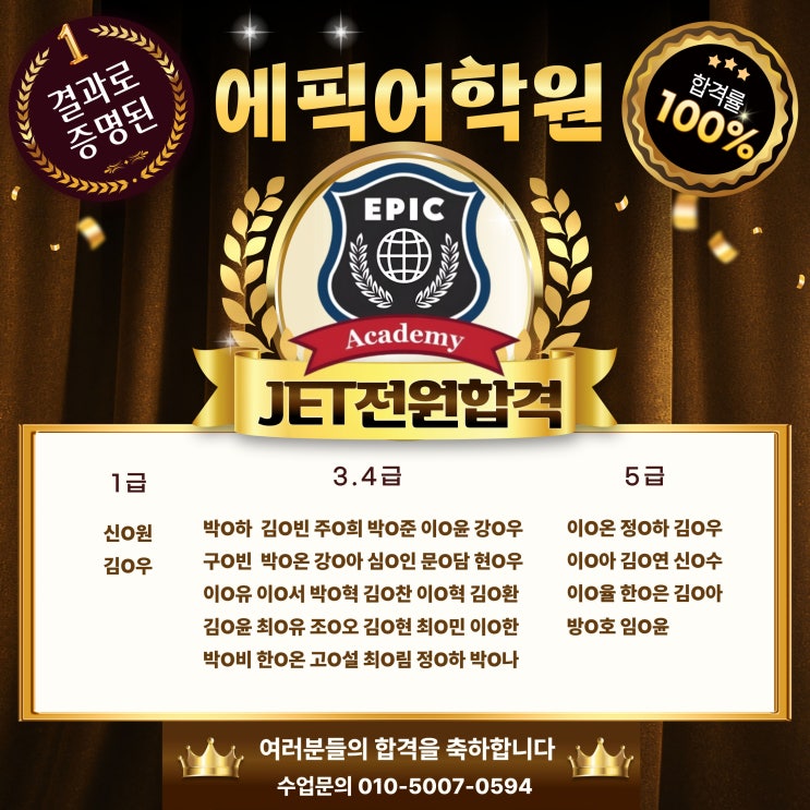 Hi~ Hello EPIC (●'◡'●) 안녕하세요~ 빛가람동 영어학원 에픽어학원입니다! 축하축하~ 에픽어학원 JET 시험 합격률 100%의 놀라운 비결 학부모님들, 우리 아이의 영어 실력을 객관적으로 확인하길 원하신다구요? 특.히. 공신력 있는 Junior TOEIC과 같은 실력인증시험에서 좋은 성적을 받고 싶다구요? 하. 지. 만. 막상 시험을 준비하려니 어떻게 시작해야 할지 ! 내 아이가 과연 좋은 성적을 얻을 수 있을지! 걱정부터 앞서실 텐데요!! 에픽어학원에서는 지난 토요일에 치러진 JET 시험으로 (Junior English Test) 이 모든 고민을 한 번에 날려버렸답니다!!! 바로 에픽어학원 재원생들의 JET 시험 합격률 100%달성 이라는....... <img src="https://blogthumb.pstatic.net/MjAyNTEyMDFfMjY4/MDAxNzY0NTU0NDA5NjMz.gmXrgrIULmJL1zlkSFJcfC-4mPK6tkTeOqJumQGl8Xcg.--dUE7KDzs3HEcr9eVzey1qrapW3pXaVmcAR-u_Flg0g.JPEG/jet1.jpg?type=s3" />