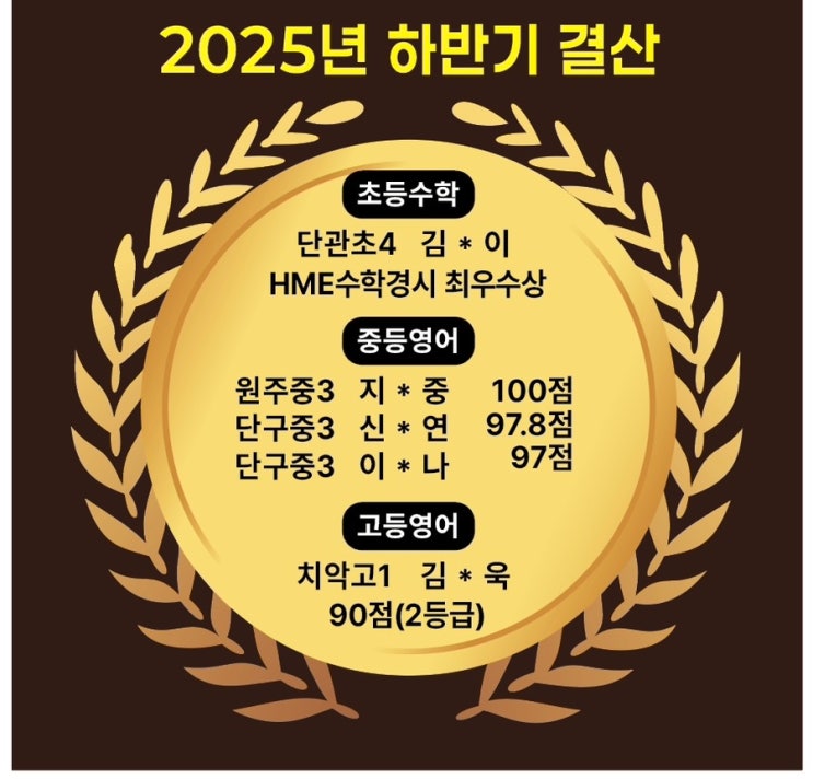 25년 하반기에도 아이들과 함께 각자의 목표를 세우고 열심히 달려온 시간이었습니다. 그 과정 속에서 노력한 만큼 좋은 결과도 보게 되어 더욱 의미있는 학기였어요. 앞으로도 아이들 한 명 한 명의 학습 목표에 맞춰 차근차근 준비하고, 스스로 성장 하며 “해냈다!”라는 성취감을 느낄 수 있도록 계속 함께 하겠습니다. <img src="https://blogthumb.pstatic.net/MjAyNjAxMTBfMTY4/MDAxNzY4MDEyOTM0NjQ3.YMITTnn12RTpruO-9A49_47WLEAwXWMEi8PhN0uassUg.ewx933bWTN2XD0L616WgXTmVrb9AvBXn35k4csC-Y6wg.JPEG/FILE000.jpg?type=s3" />