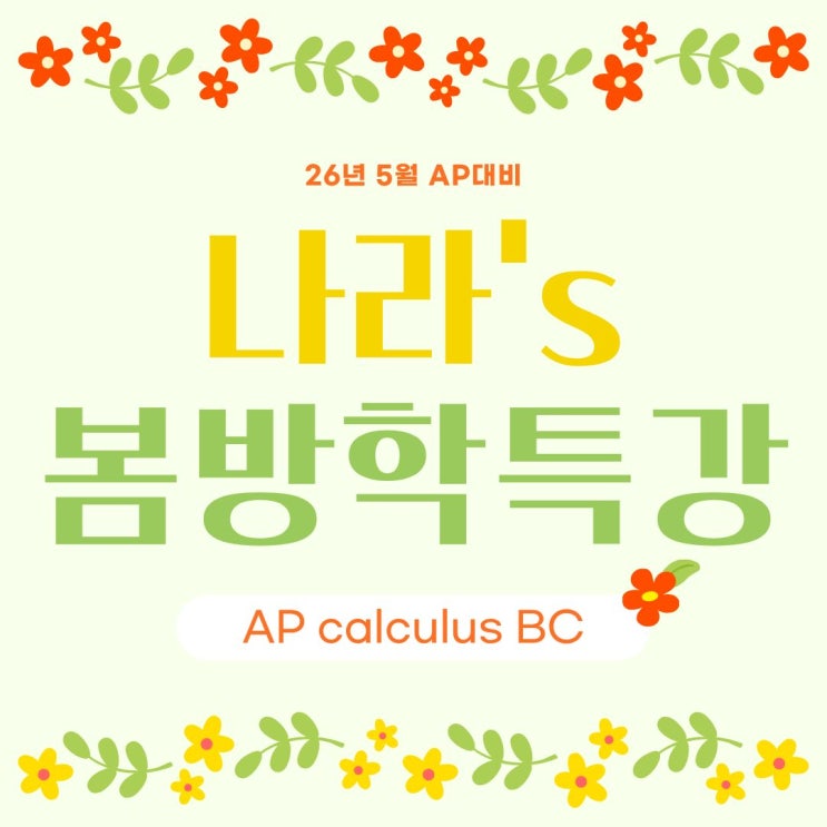 안녕하세요 해외대학 입시 전문 어학원, 에이블프렙 입니다. 특강 기준 AP가 1~2달 가량 남은 이 시점부터는 만약 개념이 완성되지 않은, 헷갈리는 부분이 있다면 그 부분을 파악하고 보완해야하는 시간이며 개념이 완성되었다면 문제풀이를 반복해야합니다. 남은 준비기간을 에이블과 함께 알차게 보내봅시다~! 수업시간 2pm-5pm (3h) 날짜 3/30-4/3 (5회) 수강 대상자 AP calculus BC 개념을 모두 끝낸 학생 수업 이후 4월 파이널 실전모의고사 수업으로 연계 됩니다. <연계수업> FRQ·MCQ 완벽 정복, 채점 기준에 맞춘 답안으로 5점 확보 AP Calculus 시험은 MCQ(50%)와 FRQ(50%)가 모두 중요하지만, FRQ가 상대적으로 더 까다로워 FRQ 성....... <img src="https://blogthumb.pstatic.net/MjAyNjAxMjhfMTgg/MDAxNzY5NTY2OTMxMTkx.siIgV3mlECcMuWzlmQ_jM39x4_VI4JWqo0rPKJHzXrMg.qtcdV5sOz5ttv6JgYGGVnsuDLhHgWwRehFbDWBq6Njog.JPEG/26_%BA%BD%C7%D0%B1%E2_%C1%D6%B8%BB_%2811%29.jpg?type=s3" />