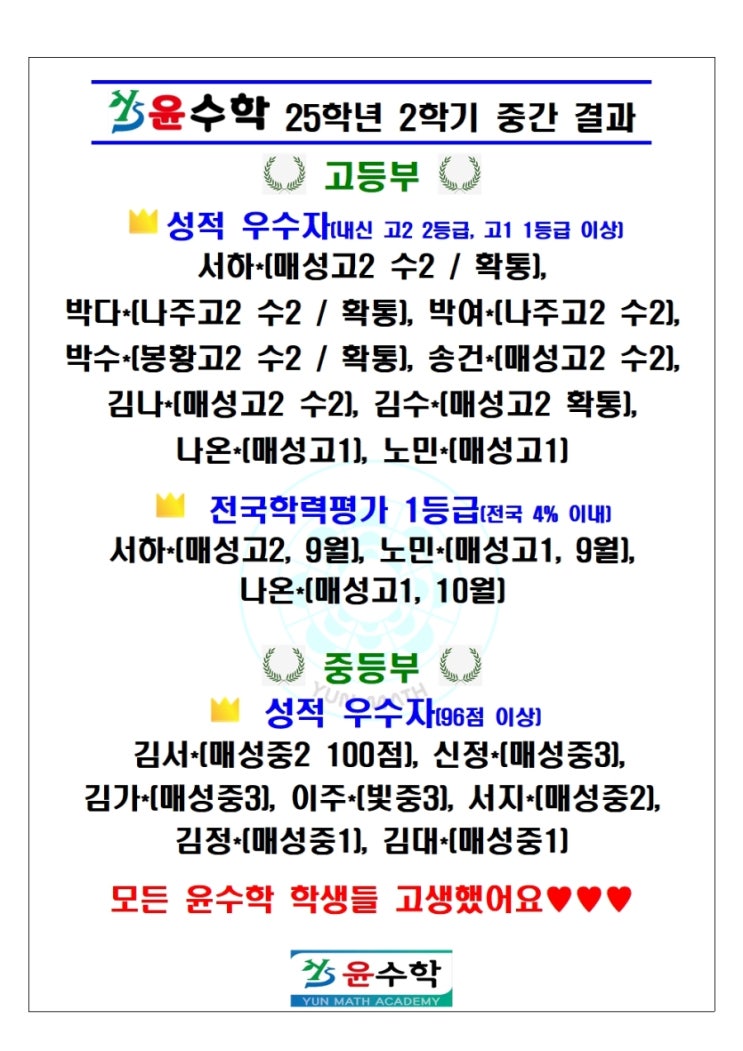 안녕하세요. 순천신대수학학원 위너스수학 안원장입니다. 중학생 친구들의 시험이 코 앞까지 찾아왔습니다. 지금까지 해왔던 본인의 학습들을 차분하게 잘 정리하고 마인드셋팅을 잘 하여 최고의 컨디션을 끌어올려 좋은 성적을 낼 수 있기를 바랍니다. 모든 친구들이 좋은 결과가 나오기를 간절히 바라며 이번 기말대비 요약집과 필수 체크 문제도 완성되었습니다. 한 명 한 명 이름을 쓰며 모든 아이들이 정해놓은 목표에 도달할 수 있기를 다시 한 번 간절한 마음을 담아봅니다. 할 수 있다고 믿든 할 수 없다고 믿든 당신이 믿는대로 될 것 이다. 지금까지 순천신대수학학원 위너스수학 안원장이었습니다. 감사합니다. <img src="https://blogthumb.pstatic.net/MjAyNTExMjhfMTAw/MDAxNzY0Mjg4NDIzMTQ2.sgzrIY249_WJhNo2EjED0jr5YcCqWPdN__gV-cFvEs0g.HjT6zfS-gr2ZRbkHmPGSLkGVXJ-QywUd_S2bsLDTMmsg.JPEG/900%A3%DF20251127%A3%DF171449.jpg?type=s3" />