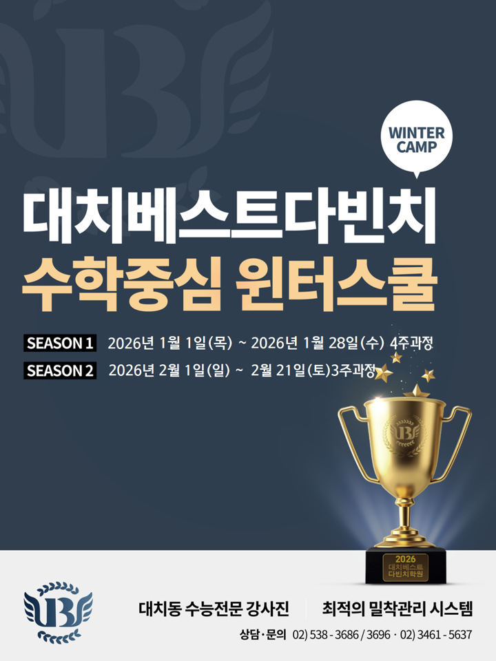 대치 베스트 다빈치학원 겨울방학 캠프 예비고1윈터스쿨 시작이 반이다 중학생 시절에는 여유롭게 공부했는데, 주변에서는 고등학교 과정은 완전 다르다고 얘기를 들으니 불안감이 커졌답니다. 고등학교 과정부터는 벌써 선행을 끝낸 친구들과 경쟁해야 하기에 쉽지 않다는 것을 깨달았고 결국 예비고1윈터스쿨을 찾아보게 됐어요. 성적 향상을 위해 초반엔 유명한 인터넷 강의를 들어보기도 했어요. 후기를 통해 어떤 부분에 중점을 두고 수업이 진행되고 있는지, 또 얼마나 효과를 기대할 수 있는지를 살펴보고 시작할 수 있다는 게 좋았어요. 하지만 기초가 부족할 때는 정규 강의만으론 이해가 안 가는 부분이 많아서 피드백을 받기가 어렵더....... <img src="https://blogthumb.pstatic.net/MjAyNTExMjZfMjAg/MDAxNzY0MTIyMDgzNjky.IA5zRSJdd0gt71SnNeFBEbQDCrtp6ji29SmQpqSphGIg.pyAOVmrO3GDDYowIJRP2KyD8ZpMud4Cp8ZAwQ0rb_rQg.PNG/%BD%BD%B6%F3%C0%CC%B5%E51.PNG?type=s3" />