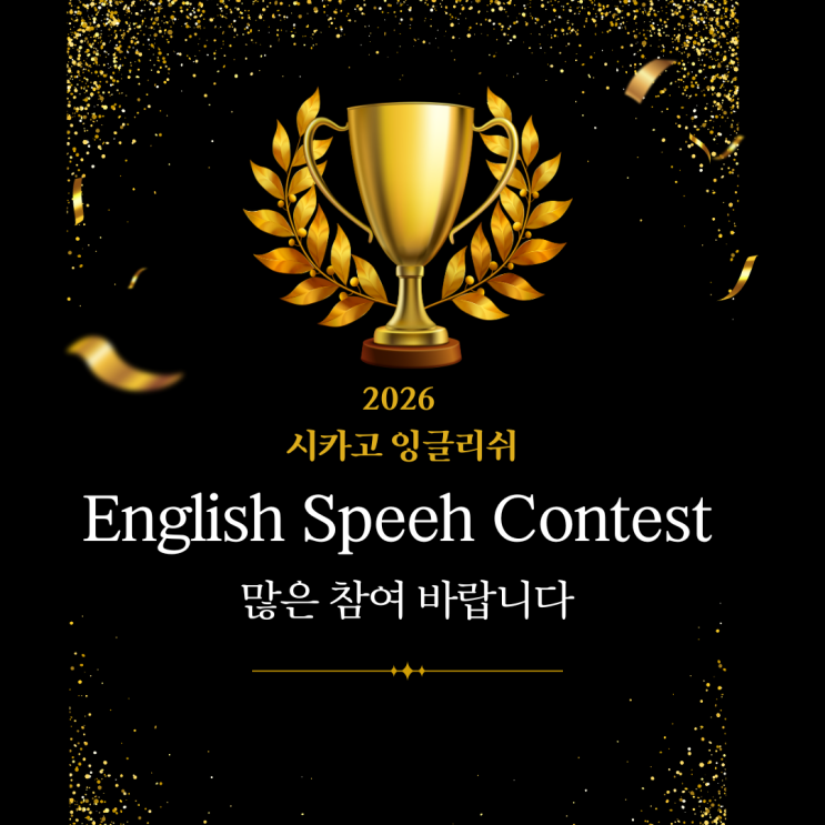 시카고잉글리쉬 스피치 대회 저희 시카고 잉글리쉬에서 2026. 2. 28. 스피치 대회를 합니다. 이번 대회는 아이들이 단순히 상을 받는 자리가 아닌, 스스로 "할 수 있다"는 자신감을 길러주는 경험이 되길 바라는 마음으로 준비했습니다. 스피치 대회를 하는 이유는 단 하나, 아이들이 한 단계 더 성장하는데 정말 큰 도움이 된답니다. 스피치 대회에 참가 하는 것은 영어 자신감 UP 영어를 전달하는 능력 향상 특별한 경험이 될 것입니다. 스피치 대회 일정은, 25.12.16. 까지 영어 원고 작성하고, 26.1.9. 영어 학원에서 예선을 거친 후, 26.2.28. 강당을 대관하여 본선 대회를 열 예정입니다. 주제는 자유 주제이며, 발표 시간은 학....... <img src="https://blogthumb.pstatic.net/MjAyNTEyMDVfMzYg/MDAxNzY0OTI0MDAyMDY0.Ndw8JmYZzUisHoQNwWXBIxshJZn1liAcyNd2_Z_rBU8g.4zlOG-SuTt-dB0g0Gp6nM7HnJ-StFPw5b4fwZA0ofSUg.PNG/1.png?type=s3" />