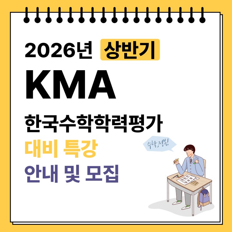 초등 수학 대표 경시대회 KMA의 상반기 시험일정이 발표되었습니다. 시매쓰 흑석센터에서 KMA 상반기 시험에 대비 특강(초등학교 1~5학년)을 시작하려고 합니다. 특강은 5월 1일부터 6월 13일까지 금요일, 토요일(학년별 상이) 총 6회 진행할 예정입니다. 모집 기간: 3월 23일 부터 4월 24일 까지 금요일: 초등학교 3~5학년 / 토요일: 초등학교 1~2학년 (학년별 대비 특강 요일은 시작 전 변경 될 수 있습니다.) 시험 범위 및 내용 초등학교 1,2 학년 25문항, 3~5학년 30문항 1학년 : 9까지의 수, 여러가지 모양, 덧셈과 뺄셈, 비교하기 2학년: 세 자리 수, 여러가지 도형, 덧셈과 뺄셈, 길이 재기, 분류하기 3학년: 덧셈과 뺄셈, 평면도형, 나눗....... <img src="https://blogthumb.pstatic.net/MjAyNjAzMTlfMTA0/MDAxNzczOTExMTU5ODMz.aX7tAHz2NoybGPWZ0RwluqdV453PKQq0gzlEc4Z7Xv8g.3GfxeuWpcKZpzoGDA5QtcIzaP_K6CSTQ_ep5TlG0IL0g.JPEG/kma-%C6%AF%B0%AD-%B8%F0%C1%FD-%BA%ED%B7%CE%B1%D7-001.jpg?type=s3" />
