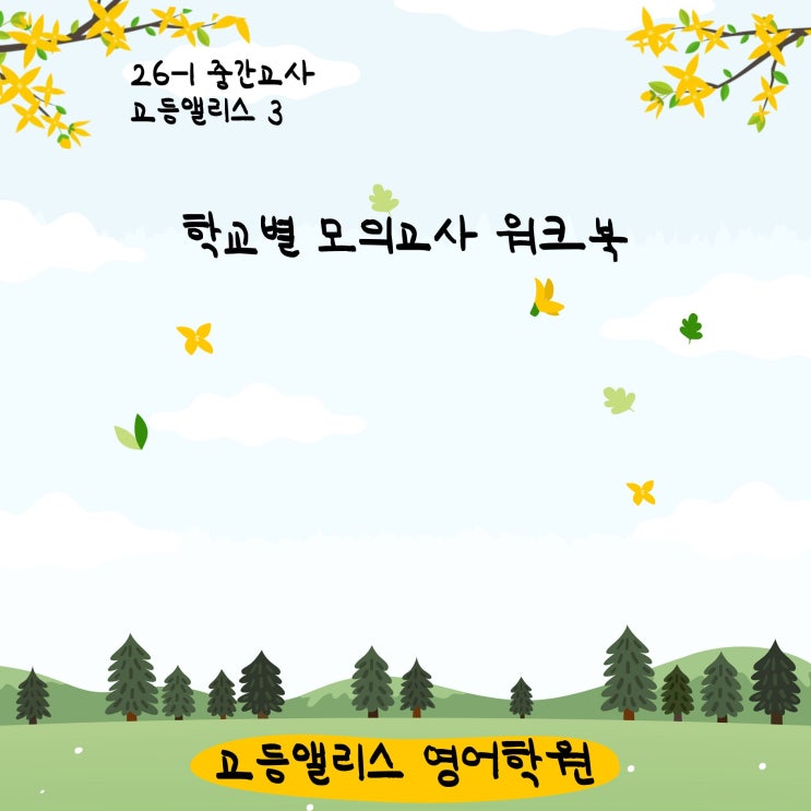 안녕하세요 고등앨리스 영어학원 입니다! 따뜻한 봄과 함께 중간고사 준비도 본격적으로 시작되었습니다~~ 이번 학기에도 고등앨리스 영어학원은 학교별 맞춤 워크북을 정성껏 제작했습니다 :) 표지부터 봄 느낌 가득하게 준비해 보았답니다 ㅎㅎ 공부하는 시간에도 조금은 밝은 기운이 함께하길 바라는 마음입니다. 1. 학교별 부교재 각 학교 시험 범위에 맞추어 부교재를 선정했습니다. 사동고 1학년 2025년 고1 6월 모의고사 사동고 2학년 2025년 고2 3월 모의고사 경산고 2학년 EBS 올포 학평 기출문제 문명고 1학년 EBS 수능특강 Light 교재 문명고 2학년 EBS 리딩파워 유형 완성 경산여고 1학년 수능만만 영어독해 20회 경산여고 2학년 리....... <img src="https://blogthumb.pstatic.net/MjAyNjAzMTlfMjQ0/MDAxNzczOTE3Nzk4ODEy.1NgAIledI8nmWLjnQ5ODi7upINHn09LXTeDYIvcBSj0g.crM6dUGNylEmu82zUZWw5pDJZu9cUGwJEXMuJayIeXQg.JPEG/%C1%A6%B8%F1%C0%BB_%C0%D4%B7%C2%C7%D8%C1%D6%BC%BC%BF%E4._%2814%29.jpg?type=s3" />