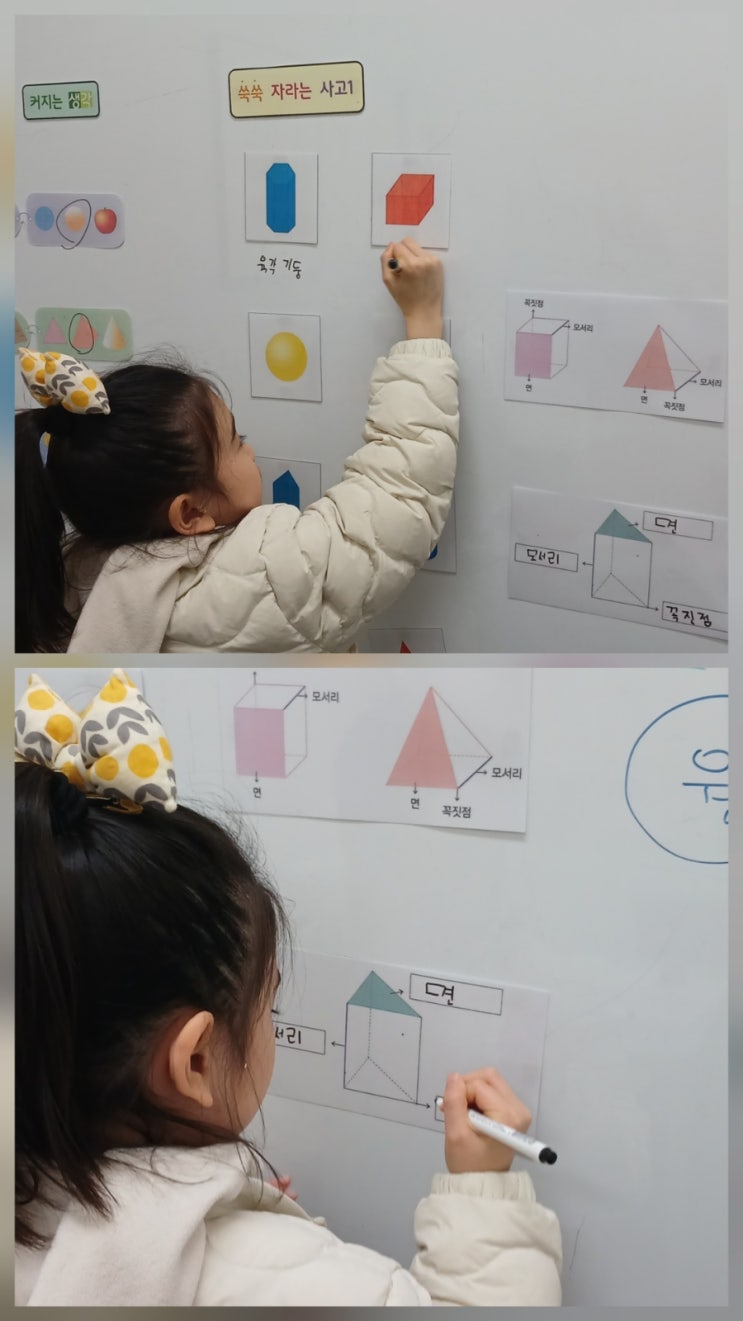 봄볕 좋은 금요일 아침이네요~^^ 입체도형은 단순히 공식을 외우는 단원을 넘어, 아이들의 공간지각능력(Spatial Intelligence)을 결정짓는 핵심 파트입니다. 평면(2D)에서 입체(3D)로 사고를 확장하는 과정은 뇌의 논리 구조를 유연하게 만들어주죠. 사고력 수학의 관점에서 입체도형이 왜 중요한가요? 바로바로~~~~추상적 사고의 완성이죠. 눈에 보이지 않는 뒷면이나 가려진 부분을 머릿속으로 그려내는 과정은 고차원적인 추상 사고 머릿속으로 상상하기 전에 교구(폼 입체도형)를 직접 만지며 '손의 감각'을 뇌에 저장 입체도형의 3대 구성 요소 면 (Face): 입체도형을 둘러싸고 있는 평면 도형 모서리 (Ed....... <img src="https://blogthumb.pstatic.net/MjAyNjAzMjBfMTYg/MDAxNzczOTcxOTk1Nzk3.3x2InyMdGzb7jDTb7I1SoOvIMeofTe05k1XkZgx6Wv8g.pxsNb-0HaD5sabd5zQUyOYaEzAyJ8OG3-oewcyOIZEgg.JPEG/900%A3%DF20260320%A3%DF073034.jpg?type=s3" />