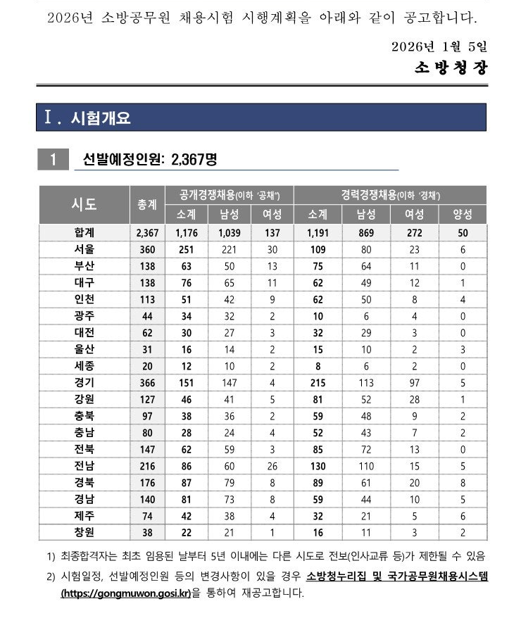 안녕하세요. 노량진 공무원 합격 노하우 그대로, 공무원 1위 공단기에서 만든 프리미엄 학습공간 커넥츠프랩 세종시 나성점입니다. 26년도 소방공무원 공채. 경채 채용인원 공지되었습니다. 시. 도별 인원 차이가 25년에 비해 줄어든 곳도 있지만 서울 및 밑에 지방에는 인원 충원이 많아졌습니다. 25년에 비해 공채는 440명 정도 경채는 170명 정도 많아졌으니 합격의 길은 더 좋아졌다고 봐야 하겠습니다. 항상 말해 왔지만 인원이 늘었다고 안심할 수 없다는 걸 인식하고 공부해야 합니다. 그만큼 내가 얼마나 더 노력하고 많은 시간을 투자하느냐의 결과물이라는 걸 잊지 마세요. 합격은 항상 여러분 앞에 있습니다. 그 문을 활짝 여는 시간....... <img src="https://blogthumb.pstatic.net/MjAyNjAxMDVfMTA0/MDAxNzY3NTkxMTM0Njgz.BeqUiqYvRoyc0J3lRb78ioiOQLeSbGku7-1lm41z3scg.zJwaSIHS1GQZh7ErlmYw6BmA46EKREA2mbQCEDiIT1Yg.PNG/20260105_111236_1.png?type=s3" />