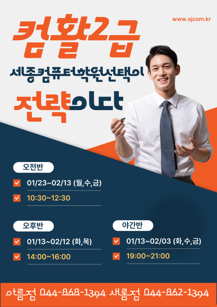 안녕하세요~ 세종시 컴활 전문 교육기관 세종컴퓨터정보학원입니다^^ 취업이나 진학, 혹은 직장 내 실무 역량을 쌓기 위해 고민 중이신가요? 가장 기본적이면서도 강력한 무기가 되는 자격증 바로 컴퓨터활용능력 2급(컴활 2급) 입니다. 하지만 누구나 따는 자격증이라고 해서 준비 과정까지 남들과 똑같을 필요는 없습니다. 세종컴퓨터정보학원에서 전략적으로 시작하면 결과가 다릅니다. 컴활 2급은 단순히 자격증 한 줄을 추가하는 것을 넘어, 실무에서 가장 많이 쓰이는 엑셀(Excel) 능력을 검증하는 척도입니다. 특성화고 입시나 대학 학점 인정, 생활기록부 기재 등에서 유리한 고지를 선점할 수 있으며, 공공기관, 일반 기업 채용 시 가산....... <img src="https://blogthumb.pstatic.net/MjAyNjAxMTJfMTYw/MDAxNzY4MTgyNzc3NTY2.aLTWhfvvbdzskt_FcRoz101L10QVJ3jfwsXhzkKjCYgg.iyt9v7tncBc-xZI5Nn2maaVg3PBmfQ0T2JPVwUeZ9Dwg.PNG/%C4%C4%C8%B02%B1%DE_%2830%29.png?type=s3" />