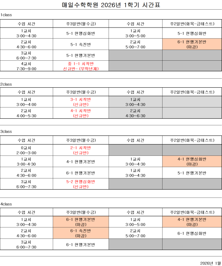 안녕하세요. 실미도샤수학 초등관 매일수학학원입니다. 2026년 시간표 안내입니다. 초등학생만을 위한 초등 전문 수학학원입니다. 초등 수학학원이라고 혹시 수업의 질이 낮은건 아닌지 걱정하신다면 절대 걱정 안하셔도 됩니다. 저희 선생님들은 15~20년의 중고등부 강의 경력이 많은 강사진으로 구성되어 있습니다. 수업 방식은 판서 수업과 개인 지도로 진행합니다. 학생들에게, 학부모님들께 좋은 말만 하지 않습니다! 전기세 내는 학생은 과감히 말씀 드립니다. 믿고 맡겨 주십시오! * 수업 시간에 따라 수업료가 상이합니다. (교육청에서 고지하는 분당 135원의 수업료에 부합한 수업료로 책정합니다. * 매일수학&실미도샤수학 형제할....... <img src="https://blogthumb.pstatic.net/MjAyNjAxMTJfMjYx/MDAxNzY4MjExNDAzNTIy.h1Hd4q9LMktcO-urzb3RJtfLX3q7wwSBHdKoa46n7YMg.ktjslYP38LiVMBTnaax67OfsbrheGiR7yucDwtU_YLAg.PNG/%C4%AB%C6%E4_%BD%C3%B0%A3%C7%A5.png?type=s3" />