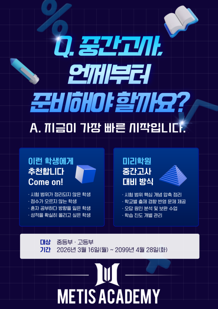 안녕하세요. 흔들리지 않는 실력완성 METIS ACDEMY입니다. 추운겨울이 지나가고, 벌써 개학시즌이 되었습니다. 개학이후, 각 학교별로 학사일정이 공개되면서, 중간고사 일정이 공개되었습니다. 저희 METIS 학원에서는 한발 빠른 준비로 학생들이 중간고사를 대비함에 있어 완벽하게 준비할 수 있도록 대비를 하려합니다. 4월달이 중간고사니, 4월부터 시험대비하면 된다는 생각은 오산!! 특히 고등부의 경우는 모든 과목이 많은 공부량을 요구하기 때문에, 3월달부터 미리 계획을 짜고 준비하지 않으면, 4월달에 공부가 점점 밀리게 됩니다. 때문에 3월달에 얼마만큼 공부를 해두느냐에 따라 중간고사의 성적이 갈린다고 봐도 과언이 아닙니다. ....... <img src="https://blogthumb.pstatic.net/MjAyNjAzMDZfMjMx/MDAxNzcyNzc5MzE3ODY4.O2VyE93BAmCOtOgtPs3Hy--uFhZlk2oHakA5NVzL8ZMg.6xYMhKD_bxa0H2v--3xNVjtwe1msJti6-AqLJZlbgsMg.PNG/%C1%A6%B8%F1%C0%BB-%C0%D4%B7%C2%C7%D8%C1%D6%BC%BC%BF%E4_-001_%288%29.png?type=s3" />