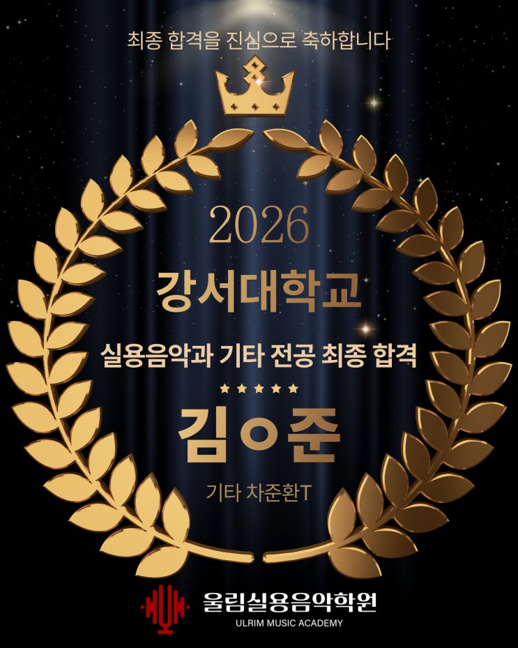 안녕하세요. 은평구 울림실용음악학원입니다. 2026학년도 실용음악과 입시에서 강서대학교 실용음악과에 합격한 학생의 기쁜 소식을 전해드립니다. 입시 결과가 발표되는 순간은 항상 설레면서도 긴장되는 시간이지만, 학생이 준비해온 과정을 함께 지켜본 입장에서는 그 노력의 시간이 떠올라 더욱 의미 있게 느껴집니다. 어렸을때부터 음악을 해야 전공을 할 수 있나요? 꼭 그런것은 아닙니다. 물론 어린 시절부터 음악을 접했다면 조금 더 빠르게 결과를 만들어갈 수는 있습니다. 하지만 울림만의 전략적인 입시 준비 시스템과 입시 경력 최소 7년 이상의 전문 강사진이 함께하기 때문에 현재의 출발선이 어디에 있든 학생의 속도에 맞는 준비....... <img src="https://blogthumb.pstatic.net/MjAyNjAzMDlfMTgx/MDAxNzczMDQ1ODUzMTA1.Lz_cPaasmN1Pm-RlhsdAoBo1_M7tkNIcXyBRUwImilgg.zpKttyaNLZG9Cnr2bekIv1MJ9mfCXv-V9F3R7OYlXY0g.JPEG/KakaoTalk_20260309_174207002_14.jpg?type=s3" />