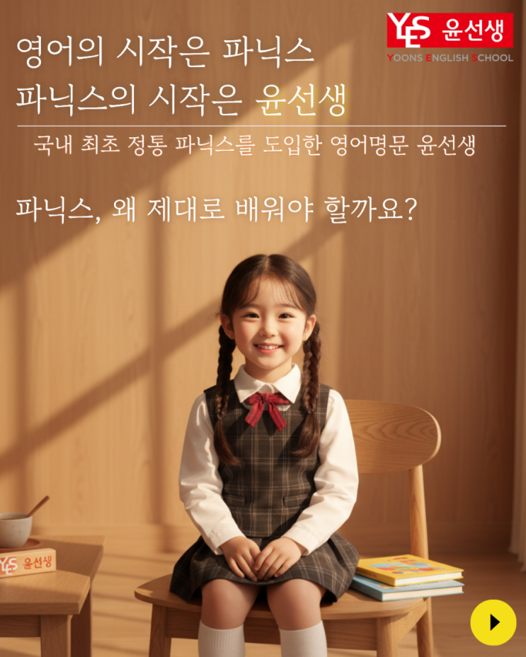우리 아이 영어의 시작, 파닉스가 왜 중요할까요? 요즘 초등 저학년 학부모님들 사이에서 가장 많이 듣는 단어! 바로 윤선생 파닉스(Phonics)’입니다. 하지만 “파닉스가 정확히 뭐죠?”, “굳이 필요할까요?”라는 질문을 정말 많이 듣습니다. 오늘은 파닉스가 아이 영어의 기초를 얼마나 단단하게 만들어주는지 쉽게 설명드릴게요. 파닉스란? 파닉스는 알파벳이 가진 ‘소리’와 철자 규칙을 연결해 읽기·쓰기 능력을 키워주는 학습법이에요. 예를 들면 A = 에이(X) → /æ/ 애(O) B = 비(X) → /b/ 브(O) 이런 소리를 정확히 알고 나면 cat / bat / map 같은 단어를 외우지 않아도 스스로 읽어내는 힘이 생깁니다! ?....... <img src="https://blogthumb.pstatic.net/MjAyNTEyMDdfMTM2/MDAxNzY1MDk3MDgwODkx.Tq5i3FkY4SdQjnIzqMgnOsfX4EltalQ8T5wPXPim3fYg.pKYXhLiIyTyLOQzLuIB4H8x4JibbUfhc_O3VqQF33-4g.PNG/900%A3%DF1764820010866.png?type=s3" />