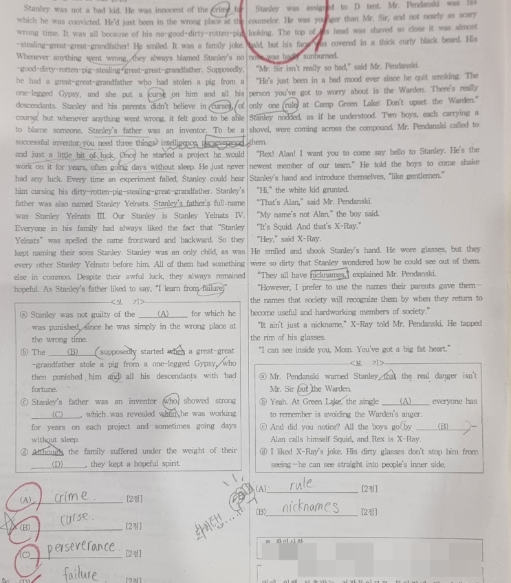 최근 독서 중심 영어 수업이 강화되면서, 단, 단순 문법 문제풀이보다 내용 이해와 추론력 평가가 중요해졌죠. 영미권에서도 청소년 필독서로 널리 읽히는 소설, 『Holes』 (루이스 새커 지음) 처인구의 한 고등학교에서 내신 시험 범위로 전 권이 지정되기도 한 작품으로, 요즘 내신은 단순 암기보다 ‘이해력과 사고력 기반의 영어 독서력’이 핵심입니다. 아래는 실제 『Holes』 원문을 바탕으로 출제된 문항 예시입니다. ↓ ↓ ↓ ↓ Mr. Sir’와 ‘Stanley’의 대화 장면을 인용해, 인물의 말의 의도와 심리 변화를 추론하는 문제가 나왔습니다. “If you want to run away, go ahead, start running.” → “이 말을 한 의도는 무엇인가?”....... <img src="https://blogthumb.pstatic.net/MjAyNTEyMDRfNTkg/MDAxNzY0ODI5MTk2MTA4.G39kyUZ4BlVNWyCCov-iTzJBWCFoGDo4gzSWgCjjecog.pr8yQ8KIum4aVmkLCl6GRMOvvArNJvpxHWpRfHhgWZEg.PNG/image.png?type=s3" />