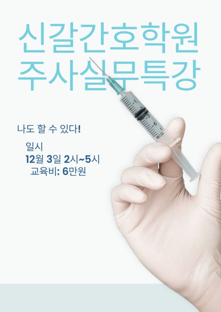안녕하세요~~!! 9월 국시후에 많은 학생들이 취업을 하셨어요!!! 주사를 배우고 싶다는 문의가 많아지고 있어서 신갈간호학원에서 준비했습니다. 간호조무사 주사 실무특강을 집중적으로 할수 있도록 교육을 마련했습니다. 이론은 이제 그만!!!! 실무가 더 중요해!!!! 소수정예 인원으로 운영하여 1:1 맞춤 지도를 실시할 예정입니다. 모집 대상 : 자격증 취득자 및 졸업생 ( 선착순 8명 ) (본원 졸업생 및 간호조무사 자격증 취득 후 임상에서 근무 중 이나 주사실무에 어려움을 겪고있어 특강 교육을 수료하고 싶으신 분들 누구나 신청 가능. 타학원생도 가능합니다) 신청기간: 2025.11.19~2025.11.30 문의 ↓↓↓ https://open.kakao.com/o/g7....... <img src="https://blogthumb.pstatic.net/MjAyNTExMTlfNjkg/MDAxNzYzNTMzMzU0MzQ1.MG-uVJsh6MheU5hZdISqcPCEnLx-8kHhmwjfzwfSf18g.IIWWixDONOem7E75ArrY6_vjfuI3H_OqkHEwqNtI-Bkg.JPEG/%C1%D6%BB%E7.jpg?type=s3" />