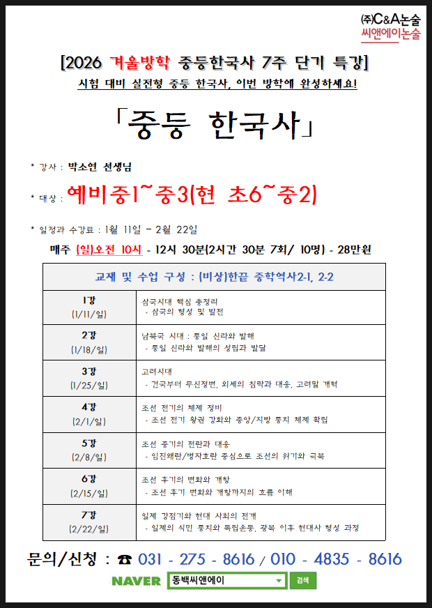 동백C&A 2026 겨울방학특강 <중등 한국사(역사2)>