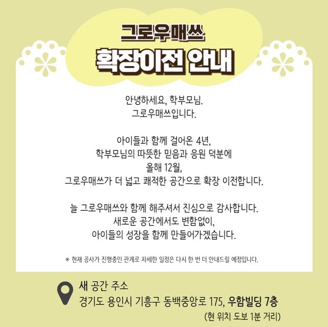 안녕하세요, 별쌤입니다! 그로우매쓰가 확장 이전을 합니다 좋은 소식으로 오랜만에 인사드리게 되어서 너무 좋네요. 아이들 시험기간과 겹쳐서 매우 바쁜 나날을 보내고 있지만, 여러 축하 말씀에 행복하게 지내고 있습니다. 곧 이전 날짜 확정하여 공지드리겠습니다. 항상 따뜻하게 바라봐 주셔서 감사드립니다. 감사한 마음 잊지않고 아이들 하나하나 최선을 다하는 그로우매쓰가 되겠습니다:) <img src="https://blogthumb.pstatic.net/MjAyNTExMjVfMjAx/MDAxNzY0MDgwNjk2Njgw.MKOsV8OFQE6BZcp-nDcWRz5WeXi2olKPubZWCNTCXjkg.g89BN3T8tSQjPV5Z3GhzMo9RoEgfGJYy1svpNv28xJwg.JPEG/IMG%A3%DF0496.JPG?type=s3" />