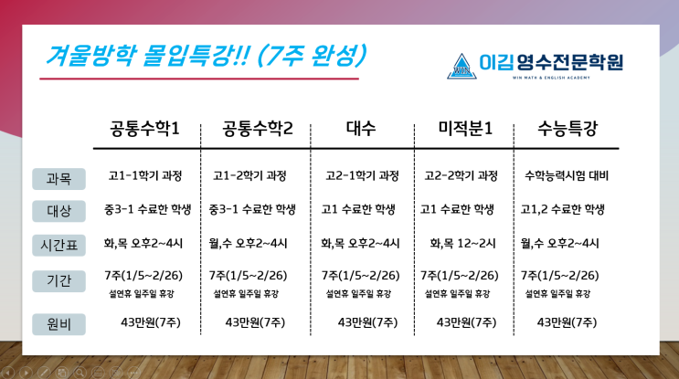 겨울방학 몰입 특강!!( 7주 완성!!)