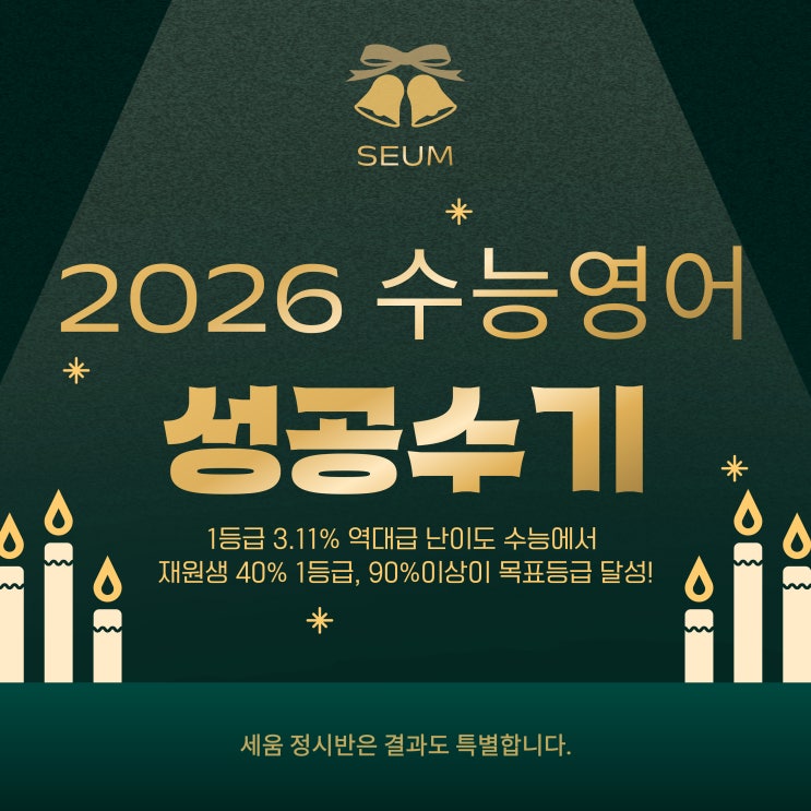 26학년도 수능 영어, 1등급 3.11% 역대급 난이도 속에서도 세움 정시반은 1등급 40%, 목표 달성률 90% 이상을 만들었습니다 전국 1등급 비율 3.11%라는 유례없는 고난도 수능. 그럼에도 세움 정시반은 수강생의 40%가 1등급, 그리고 90% 이상이 목표 등급을 달성하는 결과를 만들어냈습니다. 아래는 실제 세움 정시반 학생들이 직접 작성한 생생한 1등급·목표달성 후기입니다. 1등급 및 목표달성 수기 — 세움 정시반의 진짜 변화 백현고 3학년 이OO — 2등급에서 1등급으로, 공부 방식이 달라졌다 저는 용인백현고등학교에 재학 중이며, 세움 정시반을 듣기 전에는 모의고사 기준 영어 2등급이었습니다. 2025년 1월부터 종강할 때....... <img src="https://blogthumb.pstatic.net/MjAyNTEyMDZfMjIz/MDAxNzY0OTg3MjEzNjA0.TlJ9xh6rGilbLLulGUs9XGlAymMWvzNTa5nJi3pGp5wg.dc3woLwpEL9Gc69ufl9rtHbMsFWCd-JEhMsGLL4F40Ug.JPEG/%C1%A6%B8%F1%C0%BB-%C0%D4%B7%C2%C7%D8%C1%D6%BC%BC%BF%E4_-001.jpg?type=s3" />