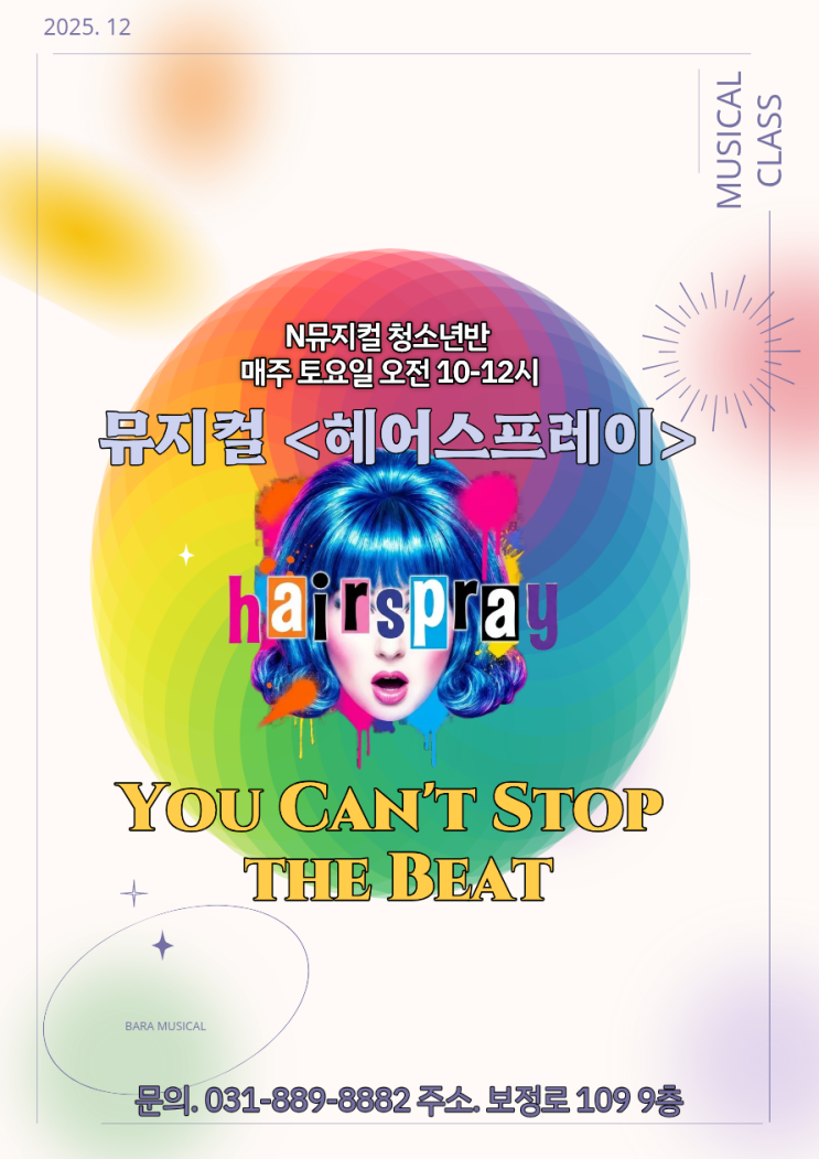 안녕하세요, 바라 뮤지컬 아카데미 입니다 우리 바라뮤지컬에는 다양한 취미반 수업들이 있어요 ! 그 중 매주 토요일 진행되는 >N뮤지컬 청소년반< 을 소개해 드립니다 ! 이번 12월 청소년반이 배울 뮤지컬 작품 입니다. 뮤지컬 <헤어스프레이> 엔딩곡 'You can't stop the beat' 뮤지컬 <헤어스프레이>의 마지막 넘버인 'You can't stop the beat'는 무대 위 배우들의 에너지와 열정을 터트리는 곡으로 경쾌한 리듬이 인상적인 넘버예요 ! 바라 N뮤지컬 청소년반은 현재 내년 2월에 있을 정기 발표회 연습으로 한창 뜨겁게 달려가고 있어요 ! 'You can't stop t....... <img src="https://blogthumb.pstatic.net/MjAyNTEyMDZfMjEw/MDAxNzY0OTg5Njg5NDEy.4bcfE46SRPDdkJ2IZpF5GDNW8mtqdPv7p-I22dwk-VEg.Vh3hKFlwXNoGNsJ1XivSAUK0-ou9Ua7CTQixTYT-1fcg.PNG/%C1%A6%B8%F1%C0%BB_%C0%D4%B7%C2%C7%D8%C1%D6%BC%BC%BF%E4._%2837%29.png?type=s3" />