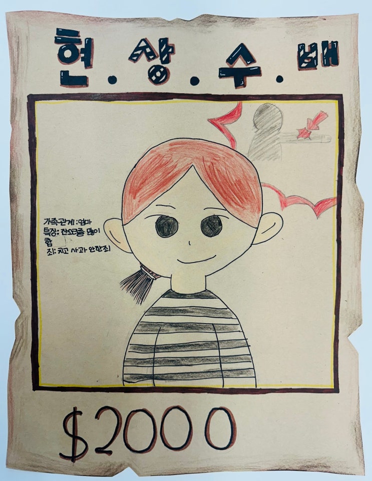 이번 수업의 주제는 “wanted”입니다! 아이들이 주제를 듣고 다 의아해했는데요^^ “현상수배” 포스터를 본 적이 있거나 무슨 말인지 아는 친구들에게는 나만의 범인! 내가 경찰이라면 잡고 싶은 사람이 누구인지 설정해서 그린다는 설명을 해주었고, 좀 더 어린 친구들에게는“사람을 찾습니다!” 느낌으로 이야기해주었더니 감을 잡았답니다. 아이들마다 얼마나 많은 이야기와 상상력이 있는지, 아이디어 스케치 하는 동안 너무 재미있었어요ㅎㅎ 우리 친구들 모두 각자 자기만의 이야기가 담긴 그림을 완성했답니다ㅎㅎㅎ 너무 귀여운 우리 크리아트 죽전 회화반 친구들의 완성작들 보여드릴게요^^ 엄마를 그린 친구ㅠㅠㅎㅎㅎ 엄마랑 아침....... <img src="https://blogthumb.pstatic.net/MjAyNTEyMThfOTcg/MDAxNzY2MDQzMTA0MzM3.9FnA3vWBRalxg42jC4YY85tCQPQkJjeRwQp2Gdbpp9Mg.g6QqQ6MTSfdZWk4OmYcG_usjaMam1iwON1ySxqyyaSog.JPEG/KakaoTalk_20251204_161951443.jpg?type=s3" />