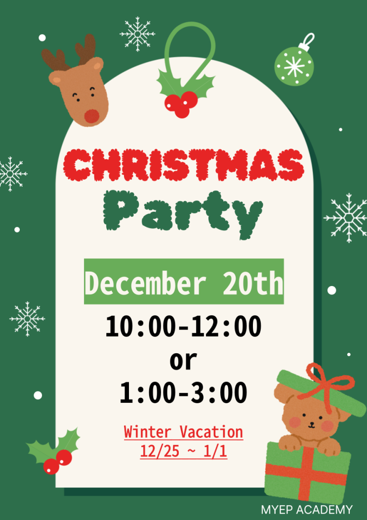 안녕하세요! 아이들과 선생님이 즐겁게 성장하는 ELiF 어학원입니다. Fun, English, and Spooky Smiles! 연말이 되어 설레이는 마음으로 EliF 어학원에서 Christmas Party를 진행했습니다 평소 수업 시간과는 조금 다른 분위기 속에서 영어와 놀이, 웃음이 자연스럽게 어우러진 시간이었습니다. 할로윈 파티에 이어서 크리스마스 파티를 기대했던 ELiF친구들이 있어서 선생님들의 손길이 안닿은 곳이 없었던 Christmas Party였습니다. 특히 각 게임에서 아이들이 영어로 대화하고, 읽고, 표현할 수 있는 게임으로 준비되었답니다. 그럼 ELiF Kids의 웃음소리가 끊이지 않던 게임의 순간들을 보여드리겠습니다. Game 1: Musical Chair 음....... <img src="https://blogthumb.pstatic.net/MjAyNTEyMjRfMjAg/MDAxNzY2NTU5OTU3NzQy.Xnaa1kCpSEXXkPC4JJ3-eLz5-u8u_PI9HE0pdya-8Fog.PuvalZzqTMdKm49VaKQnSKG5ojP0JBun0qYLQzVEsVEg.PNG/%C5%A9%B8%AE%BD%BA%B8%B6%BD%BA-%C6%C4%C6%BC-001_%282%29.png?type=s3" />
