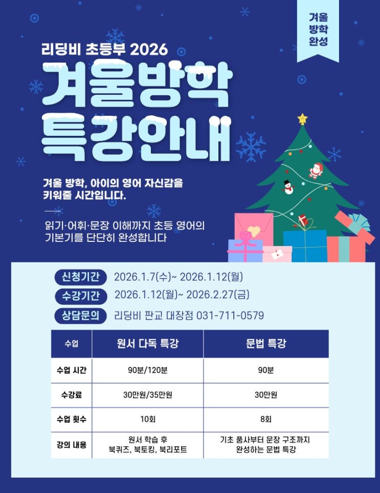 리딩비 초등부 2026 겨울방학 특강 안내드립니다. 겨울방학은 학기 중에 놓치기 쉬운 영어 기본기를 다시 다질 수 있는 가장 중요한 시기입니다. 이번 리딩비 겨울방학 특강은 아이들이 영어를 어렵게 느끼는 것이 아니라, 읽고 이해하고 표현하는 경험을 통해 자연스럽게 자신감을 키울 수 있도록 구성되었습니다. 읽기, 어휘, 문장 이해까지 초등 영어의 핵심 기본기를 탄탄하게 완성하는 시간입니다. 특강 일정 한눈에 안내드립니다. 신청기간 2026년 1월 7일 수요일부터 2026년 1월 12일 월요일까지 수강기간 2026년 1월 12일 월요일부터 2026년 2월 27일 금요일까지 상담 및 문의 리딩비 판교 대장점 031-711-0579 첫 번째, 원서 다독 특강....... <img src="https://blogthumb.pstatic.net/MjAyNTEyMzBfMTIz/MDAxNzY3MDg1NTY5NzEx.ek2gWPrCP_m6rNIqDb61vqWqA2LgPDA6OZVJF7XmGokg.HeczeMSWLgDDf5zWhsbaRvwygsLltV_2Kx1Slt-h9dIg.JPEG/KakaoTalk_Photo_2025-12-26-19-03-02.jpeg?type=s3" />