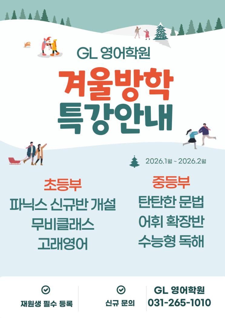 ❄️ GL영어학원 겨울방학 특강 OPEN ❄️ 겨울방학, 그냥 보내기엔 아까운 두 달. 영어 실력이 분명하게 달라지는 시간, GL영어학원이 준비했습니다. 수업 기간 1월–2월 (총 2개월) 대상 초등부 · 중등부 전 과정기존 재원생은 물론, 두 달 후 확실한 성장을 원하는 신규 원생도 환영합니다. 초등부는 재미있는 무비 클래스와 고래영어 컨텐츠를 활용해 영어를 공부가 아닌 경험으로 즐기는 수업! 영어가 자연스럽게 좋아지는 겨울방학을 만듭니다. 중등부는 영어 실력의 뼈대가 되는 탄탄한 문법, 그리고 실전으로 이어지는 독해 집중 훈련! 매 수업마다 차곡차곡 쌓이는 꾸준한 학습으로 방학 동안 실력을 확실하게 끌....... <img src="https://blogthumb.pstatic.net/MjAyNjAxMDdfMTA1/MDAxNzY3NzY1NzQ0OTIw.IiWT5-HDsaX5NyZW87hWrsJaPoygTM5SmBZqIL9oGygg.azeaT5OR6HPQcUnL9v11j7x9F9123_Hz2gMo67DInaIg.PNG/%C1%A6%B8%F1%C0%BB_%C0%D4%B7%C2%C7%D8%C1%D6%BC%BC%BF%E4._%281%29.png?type=s3" />