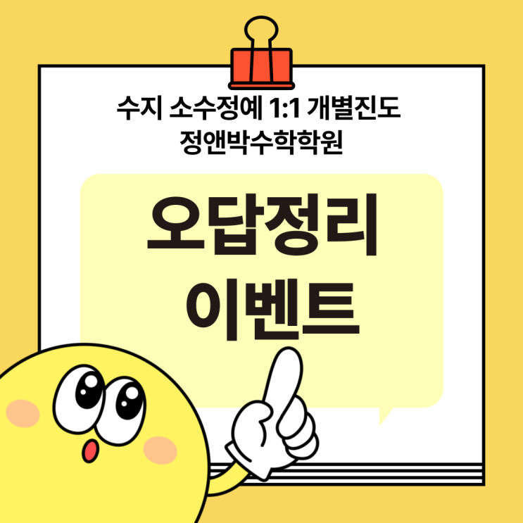 안녕하세요 수지 소수정예 1:1 개별진도 맞춤수학전문 정앤박수학학원입니다 방학은 단순히 ‘선행만 하는 시간’이 아닙니다. 지금까지 틀렸던 문제를 어떻게 정리하느냐에 따라 다음 학기 성적이 달라집니다. 특히 수학은 ✔️ 개념은 아는데 점수가 안 나오는 학생 ✔️ 객관식은 맞히는데 서술형에서 감점이 많은 학생 ✔️ 수행평가에서 식을 제대로 못 써서 점수를 놓치는 학생 에게 오답정리가 가장 중요한 시기입니다. 그래서 이번 방학, 수지 소수정예 1:1 개별진도 맞춤수학전문 정앤박수학학원에서는 방학 중 오답정리 집중 이벤트를 진행합니다. 오답정리, 혼자 하면 안 되는 이유 오답노트를 만들라고 하면 대부분의 학생들이 이렇....... <img src="https://blogthumb.pstatic.net/MjAyNjAxMDdfMjcw/MDAxNzY3NzkyNjA5NjIw.EBdtgytCBYoVywKJO-rZek6hI1anddlR64OXClRUXMwg.f6LG4ZzUMIItgzOoEGlQBzXoO5JkWlQzt0W23viqz8Ug.PNG/001.png?type=s3" />