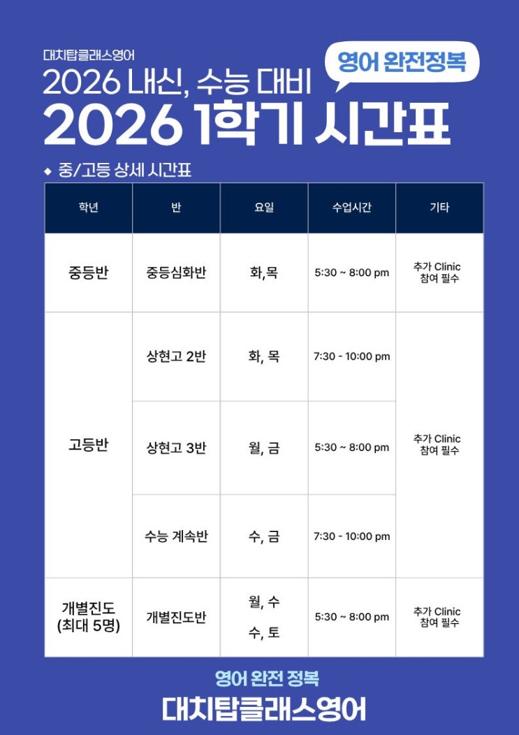 대치탑클래스영어 2026 1학기 내신/수능 시간표❤️ (상현영어, 상현고, 상현중, 이의고, 이의중, 서원고, 서원중, 중고등내신, 수능영어)