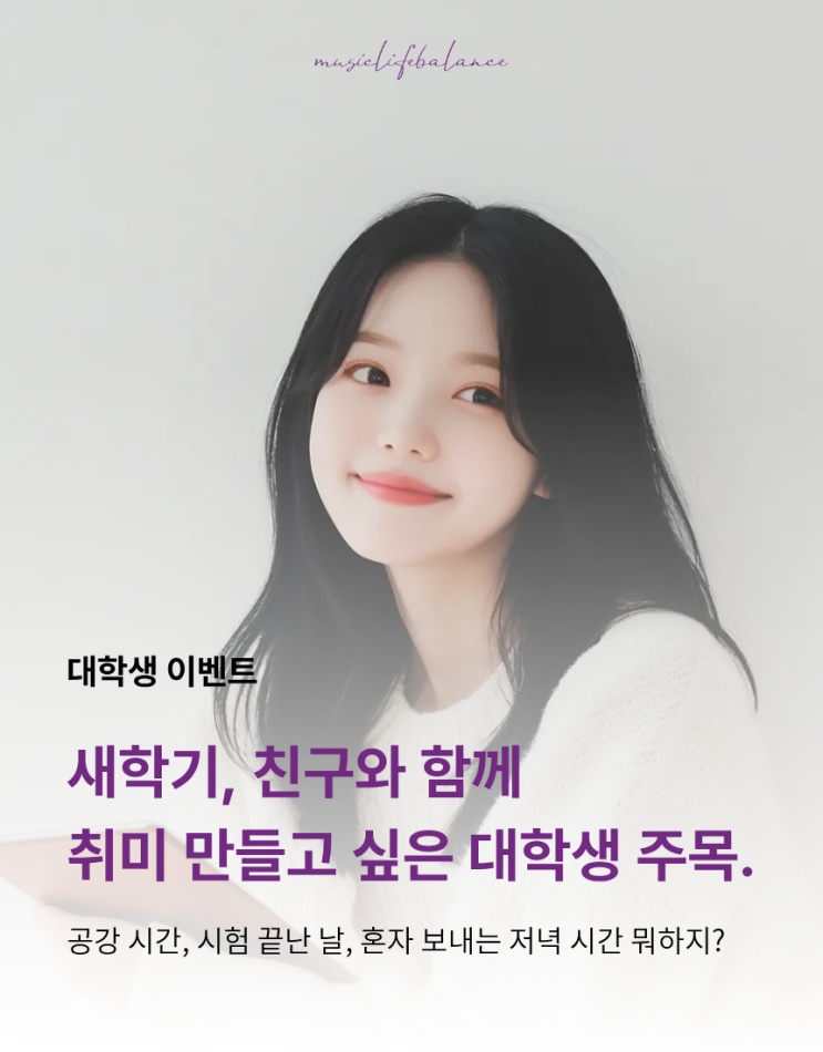 대학생만을 위한 봄 이벤트 수업과 과제 사이, 내가 좋아하는 걸 하나쯤 꾸준히 해보고 싶었다면 이번 봄이 딱 기회에요. 왜냐면요 대학생이라면 더 ! 가볍게- 시작하실 수 있도록 뮤라벨이 준비했거든요. 대학생 인증 시 특별 할인 혜택 제공 • 대상 : 대학생 / 휴학생 가능 • 기간 : 봄 시즌 한정 (~4/10까지) • 과목 : 피아노, 바이올린, 첼로, 성악 전 과목 교차수강 가능!! 새 학기와 함께 나를 위한 새로운 취미, 새로운 루틴을 만들어보세요. 지금 바로 체험레슨으로 시작하러 가기 GO #성인전문학원 #뮤라벨 ⚫운영시간⚫ 매일(월-일) 6:00 - 24:00 상담 가능시간 14:00 - 22:00 법정공휴일/대체공휴일 정....... <img src="https://blogthumb.pstatic.net/MjAyNjAzMDhfMjc2/MDAxNzcyOTUwMTc4NzA3.v7Bpr-adQ8T5sy_qAtrv4wfwHsXpBKqV4wfva7IgW6og.aebNE7X_KJRTNFssspeqnym4JY_9AQQyQHXP6HYb4qcg.PNG/1.png?type=s3" />