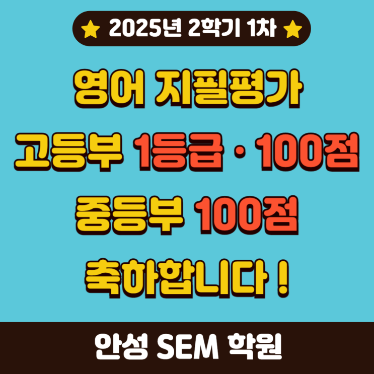 [안성 영어,수학학원 안성 SEM학원] - 2025년 2학기 1차, 영어 지필평가 고등부 1등급, 100점 & 중등부 100점 축하합니다!