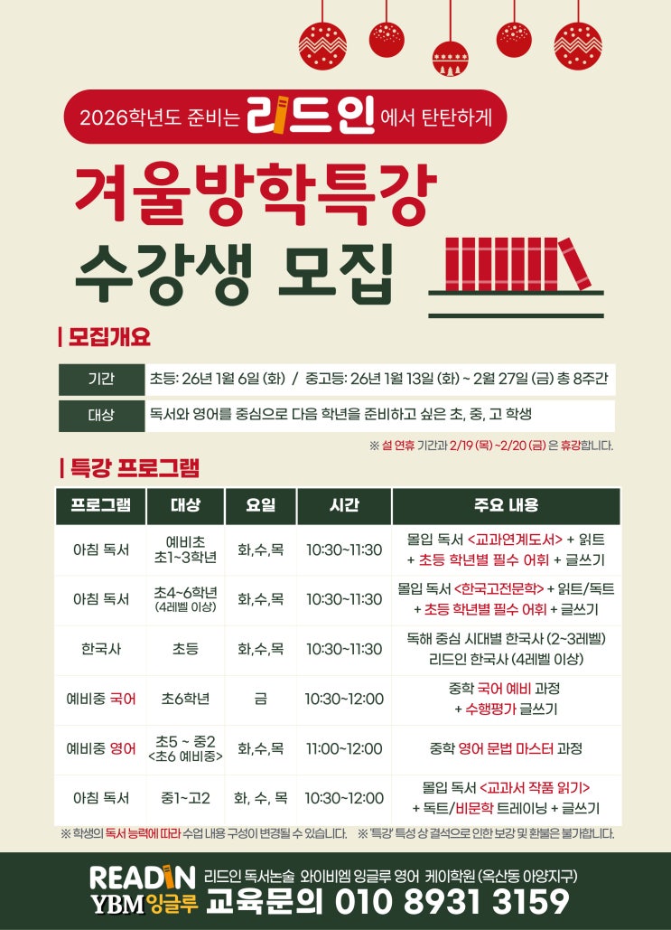 2026학년도 준비, 안성 케이학원 겨울방학 <독서, 영어> 특강 안내