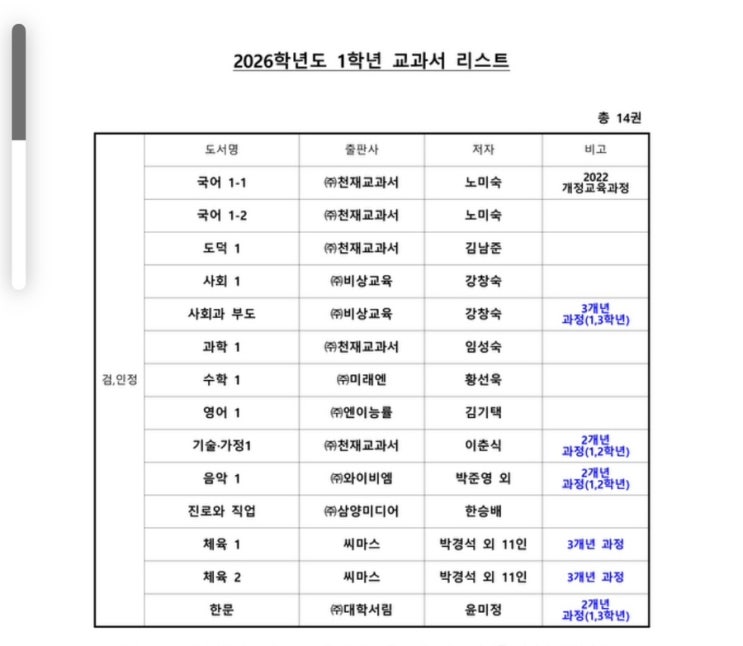 김포한가람중학교 26학년도 교과서