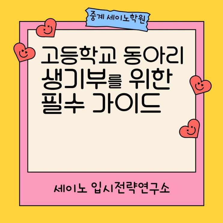 안녕하세요. 대한민국 모든 수험생과 학부모들의 관심사였던 수능이 지나고 지금은 학교별 논술고사와 면접고사로 또 다시 바쁜 나날을 보내고 있는 중계 세이노 학원입니다. 대학 입시 전형에는 수시와 정시전형이, 수시전형에는 학생부 교과와, 종합, 논술전형이 있는데요. 오늘은 학생부 종합 전형에서 나만의 스토리를 만들어 가는 과정에 있는 고등학교 동아리, 생기부를 풍성하게 만드는 노하우에 대해 알아보려 합니다. 중학교 3학년이 되면, 고등학교 생활에 대한 기대와 걱정이 함께 찾아옵니다. 특히 많은 학생과 학부모님들은 동아리에 대해 어떻게 접근해야하나 막막하실거에요. 사실 동아리는 단순한 취미 활동을 넘어, 진로 탐색과....... <img src="https://blogthumb.pstatic.net/MjAyNTExMjFfMTQy/MDAxNzYzNjkzMjk4NDYx.EMQkBCYKtsRGdBUS3wutssKXuP7Rabazlu-QKdn-Mugg.0cl0bR53wc2Z4qgOwGFl4HMavwfjR7YzbuuN8CEOZEcg.JPEG/%C1%A6%B8%F1%C0%BB_%C0%D4%B7%C2%C7%D8%C1%D6%BC%BC%BF%E4_%281%29.jpg?type=s3" />