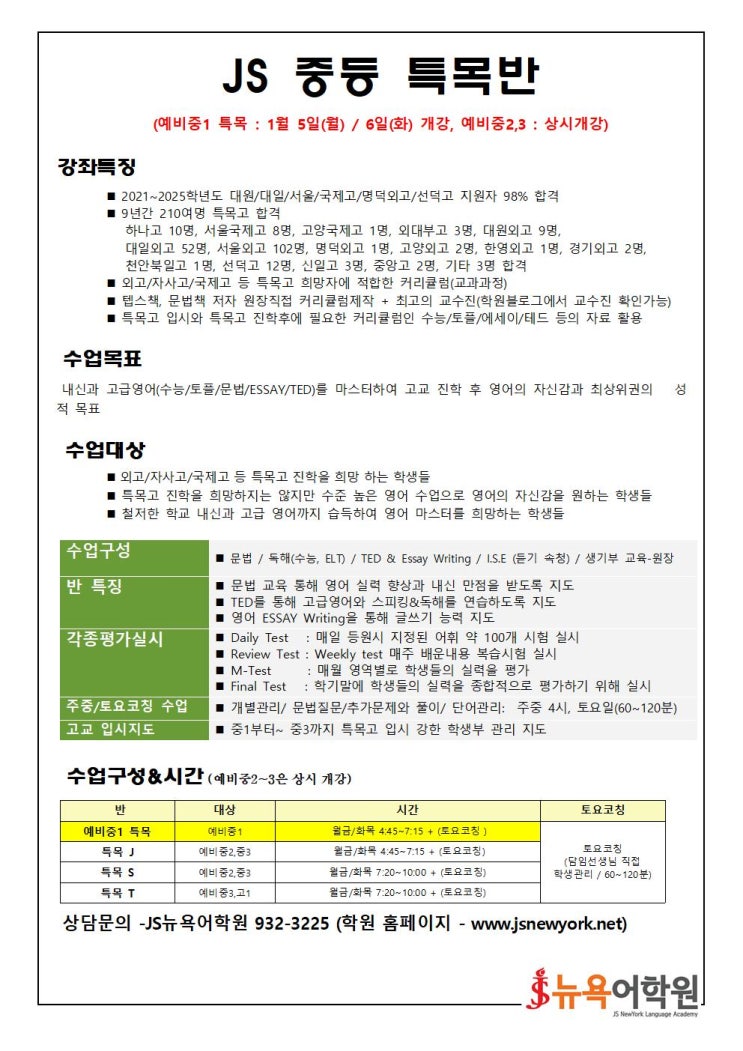 JS뉴욕 2026 중등특목반 안내 (1월 개강반 포함)