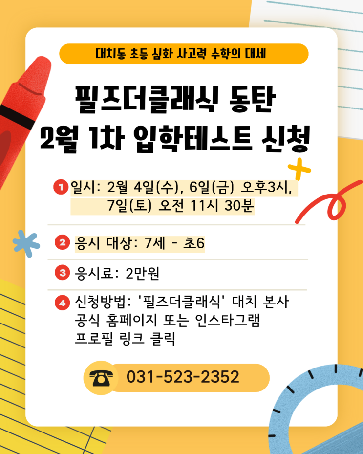 안녕하세요! 2월 1차 입학테스트 신청을 오픈하였습니다.✨ ✔️ 응시 일시: 2월 4일(수), 6일(금) 오후 3시, 7일(토) 오전 11시 30분 ✔️ 응시 대상: 7세(2020년생) - 초6 ✔️ 응시료: 2만원 ✔️ 신청 방법: '필즈더클래식' 대치 본사 공식 홈페이지 또는 아래 링크 클릭 ☎ 교육 문의: 031-523-2352 필즈더클래식 동탄센터의 소식을 가장 빠르게 확인 하실 수 있는 공식 인스타그램 계정 안내드립니다. <img src="https://blogthumb.pstatic.net/MjAyNjAxMjdfMjk3/MDAxNzY5NDkyMDY3MzEx.P9JZOESfuGIaPPmg1TDhAKB83kGd_1YoZq-Dgdhgwaog.8QVe68LlqSVp7X7UrE5FKkAu1m2-Dypv1QZdlwDvX4gg.PNG/2%BF%F9_1%C2%F7_%C0%D4%C7%D0%C5%D7%BD%BA%C6%AE.png?type=s3" />