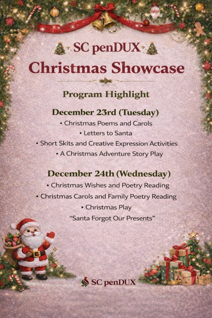 이번 SC PENDUX 크리스마스 쇼케이스는 아이들이 얼마나 성장했는지를 함께 느낄 수 있었던 소중한 시간이었습니다. 무대 위에서 자신감 있게 발표하고, 서로를 응원하며 끝까지 최선을 다하는 아이들의 모습이 정말 자랑스러웠습니다. 항상 따뜻한 응원과 믿음으로 함께해 주시는 학부모님들께 진심으로 감사드립니다. 앞으로도 아이들이 즐겁게 배우고 성장할 수 있도록 최선을 다하겠습니다. 다가오는 새해에도 SC PENDUX 학생들의 성장에 많은 관심과 응원 부탁드립니다. 감사합니다. ✨ This December, SC penDUX was filled with warmth, laughter, and holiday spirit during our Christmas Showcase. Over two special days, our stu....... <img src="https://blogthumb.pstatic.net/MjAyNjAxMjdfODcg/MDAxNzY5NTEwNjMwODc3.x2XYXCcDdN7-Fx0HXPZ9qmzO1r6gCgVDnlvMuZuKUPgg.QaYedlJPt94t-O89MiFTh5mOc4hPs1S0Z5qBkbceSdQg.JPEG/KakaoTalk_Photo_2026-01-14-18-43-41.jpeg?type=s3" />